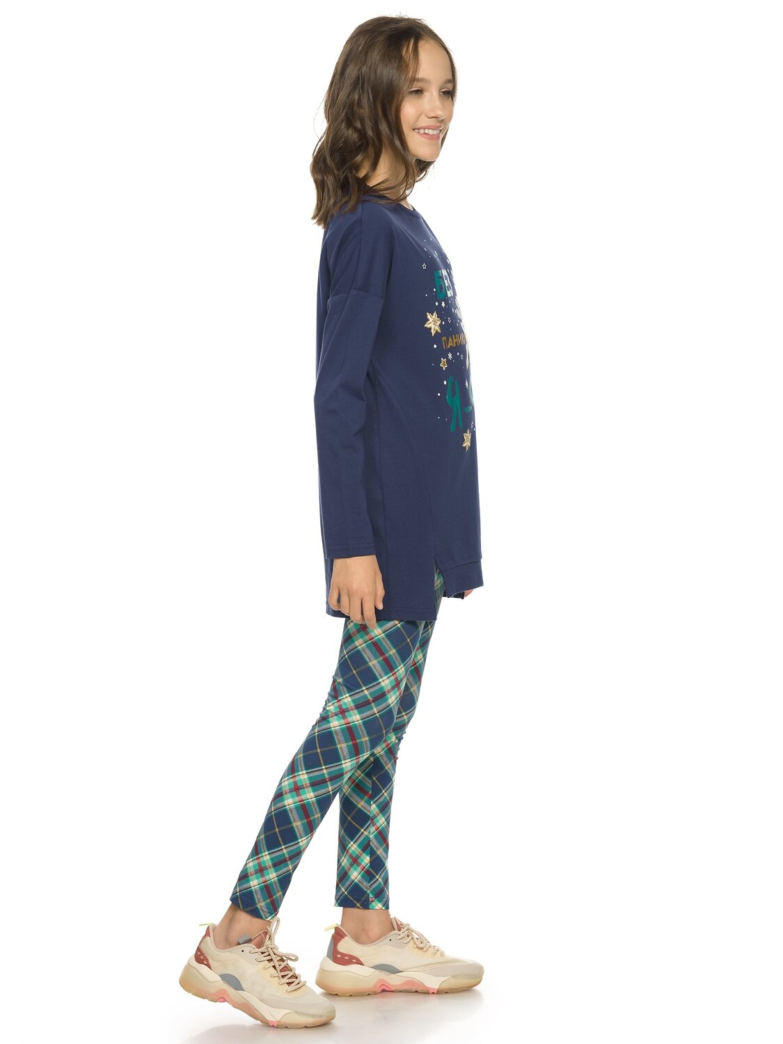 Комплект для девочек. Туника О образного силуэта с перепадом длин между передом и спинкой, спущенное плечо, боковые швы переведены на перед, оканчиваются небольшими разрезами. Принт в виде пряничного оленя, с золотом, бирюзовым глиттером и металликом, стразами. Классические лосины в All over принт клетку.