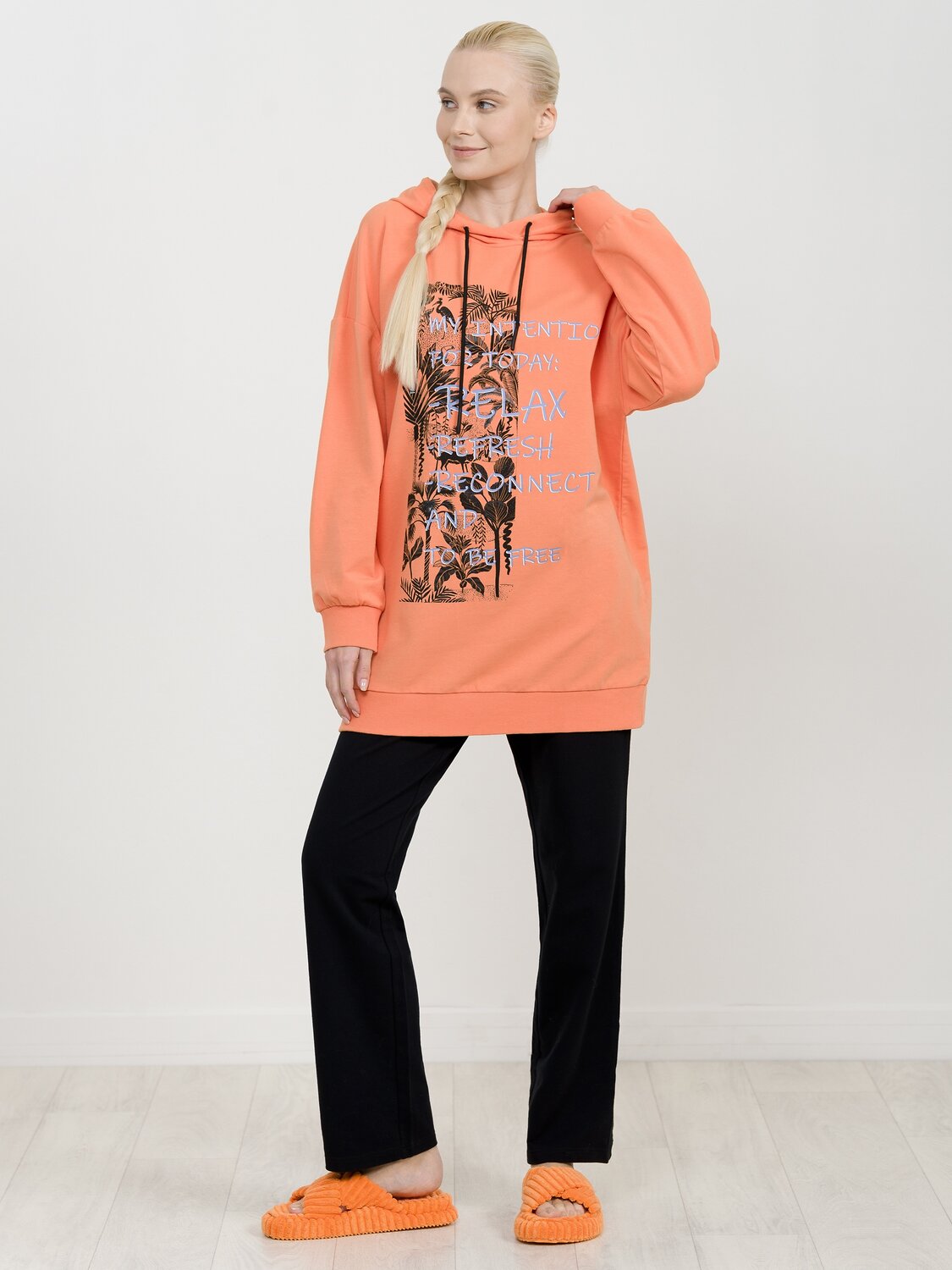 Удлиненное худи мангового цвета большого объема с эластичным принтом с глянцем. Манжеты по низу рукава и низу изделия из рибаны. Объем капюшона регулируется шнурком черного цвета. Перевод Мои намерения на сегодня расслабиться, освежиться, перезагрузиться и быть свободной.