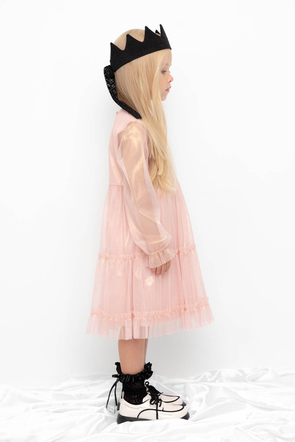 Нарядное платье для девочки из высококачественного трикотажа супрем с лёгким слоем из сетки с золотым переливом. Длинные рукава из сетки собраны на резинку. Для удобства одевания платье застёгивается на пуговицу на спинке. Платье сохраняет форму и стойкий цвет после многочисленных стирок и идеально подходит для праздников и фотосессий.