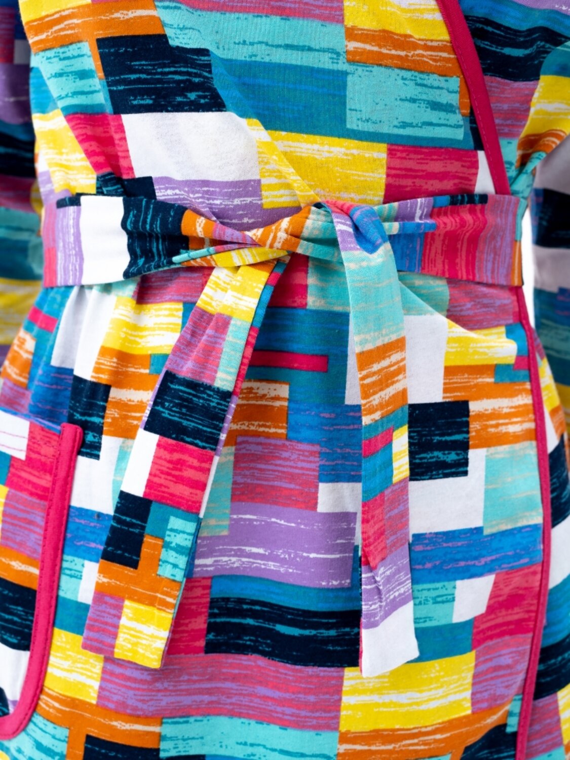 Халат на запахе длиной ниже колена - классическая модель для домашнего отдыха. Трикотаж на основе хлопкового волокна - самый комфортный материал для тела. Халат на запахе прямого силуэта без воротника. Рукав базового покроя, втачной, длиной3/4. Полочка со смещённым бортовым краем с накладным карманом. Края борта, а также контур кармана оформлены отделочным кантом. Спинка цельнокроеная.