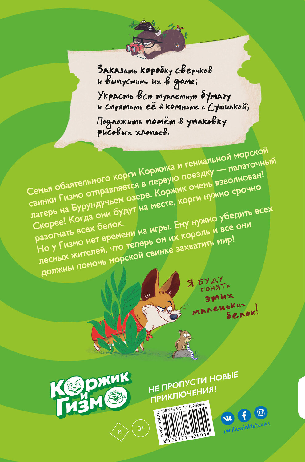 Семья обаятельного корги Коржика и гениальной морской свинки Гизмо берут их в первую поездку - в палаточный лагерь на Бурундучьем озере. Коржик очень взволнован! Скорее, когда они уже будут на месте, корги нужно срочно разогнать всех белок. Но у Гизмо нет времени на игры. Ему нужно убедить всех лесных жителей, что теперь он их предводитель, и все они должны теперь помочь Гизмо захватить мир! Автор Сьюзен Селфорс придумывает самые разные истории всё время. А вдохновение она черпает благодаря любимым писателям Чарльзу Диккенсу и Роальлу Далю. "Великий побег" - третья книга серии о самой дружелюбной на свете собаке и мрачном гении-морской свинке.