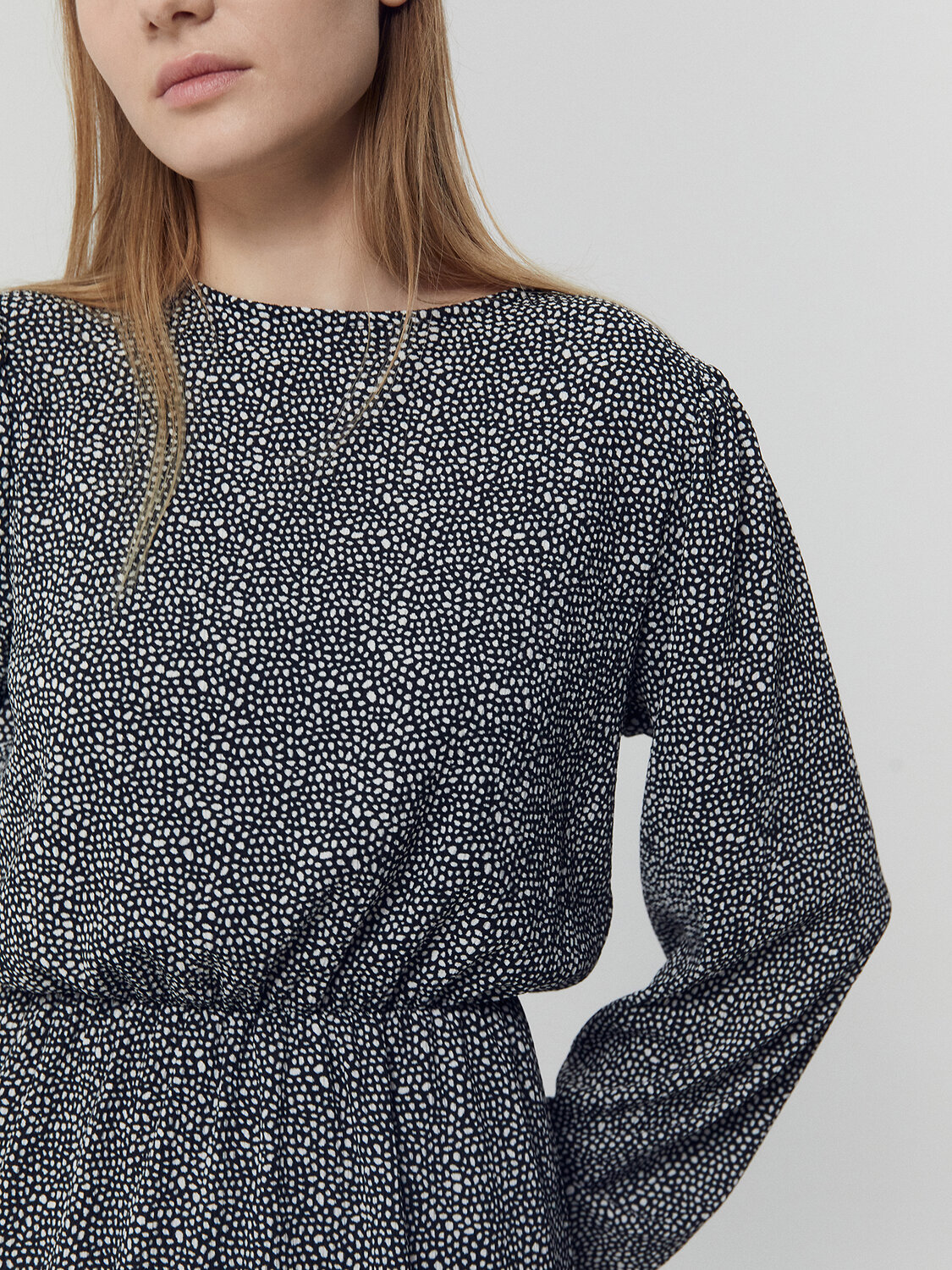 Платье женское полуприлегающего силуэта из ткани рошель. Горловина круглой формы, окантована бейкой из основного полотна. Рукав втачной, по окате с небольшой сборкой. Низ рукава подгибка с эластичной тесьмой внутри, образует сборку. Платье отрезное по талии с эластичной тесьмой, по талии присборено. Платье длиной по колено.