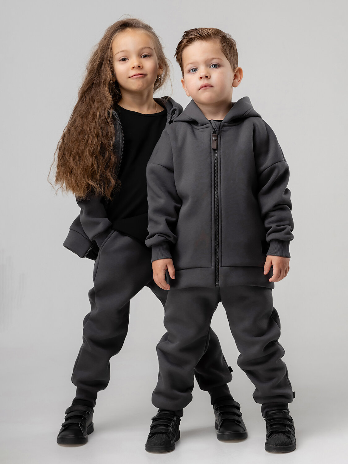 Костюм детский. Толстовка: свободный покрой, застежка - молния, рукава на манжетах, защитная планка на молнии, несъемный капюшон, прорезные карманы. Брюки- джоггеры, детали: пояс - эластичная резинка, низ изделия - манжеты, карманы с отрезным бочком. Состав: футер трехнитка с начесом 80% хлопок 20% полиэстер