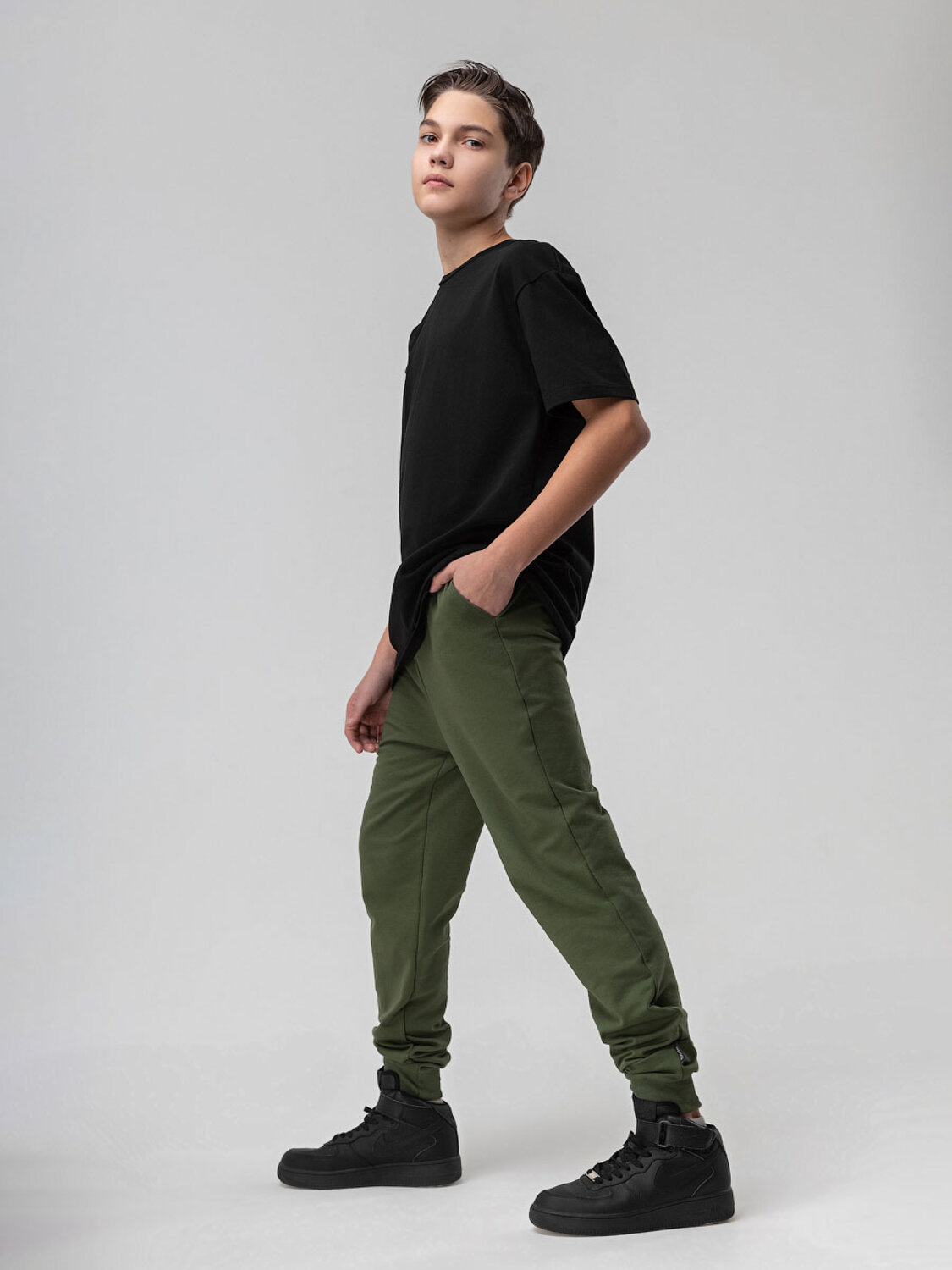 Брюки для детей школьного возраста. Брюки- джоггеры. Детали: свободный покрой, пояс - эластичная резинка, низ изделия- манжеты, карманы с отрезным бочком. Состав: футер двухнитка 92% хлопок 8% лайкра