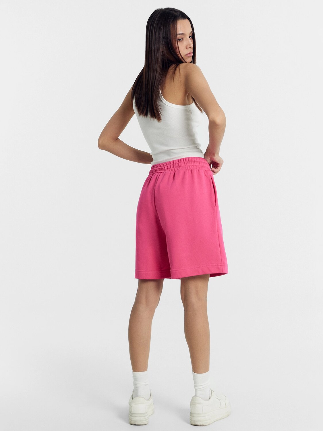 Шорты женские свободного силуэта из трикотажного полотна футер. Пояс отрезной из основного полотна с эластичной тесьмой внутри, по поясу проложены отделочные строчки. На внутренней части пояса пробиты петли и вставлен шнур. Карманы в боковых швах, подкладка карманов из кулирки. Шорты длиной выше колена. Шорты 132359-1 на поясе пробиты петли и вставлен шнур круглый двойной с термоусаживаемой трубкой на конце.