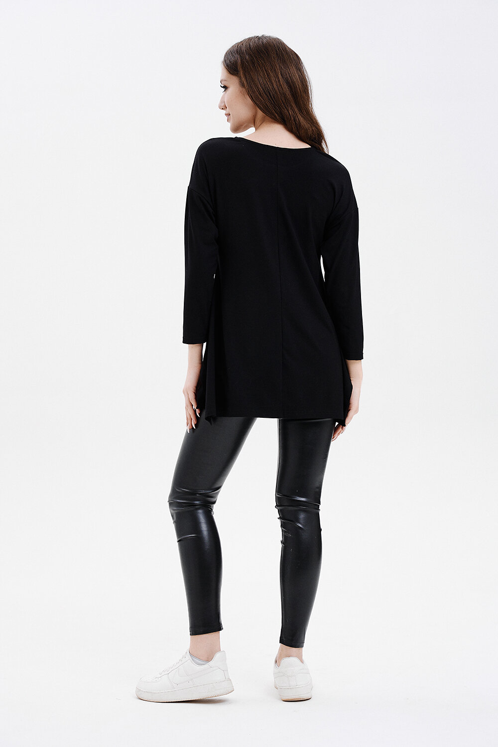 Туника прямого силуэта, с V-образной горловиной, с разрезами в нижней части боковых швов. Спинка удлиненная. Рукав втачной, длинный. Горловина обработана обтачкой из основного полотна.