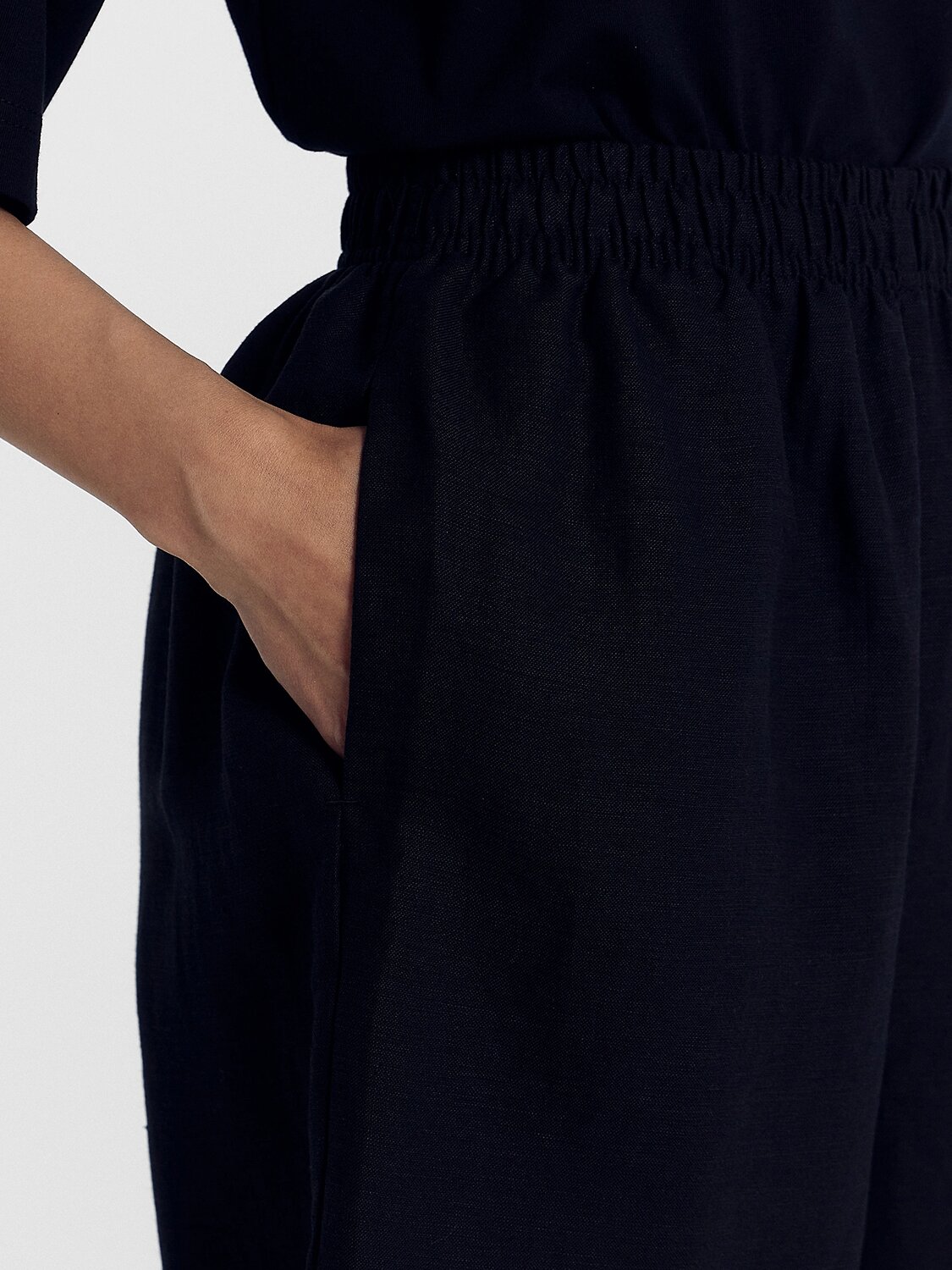 Шорты свободного силуэта, короткие. Пояс цельнокроеный, с втаченной эластичной тесьмой 40RV. Низ шорт обработан швом в подгибку.