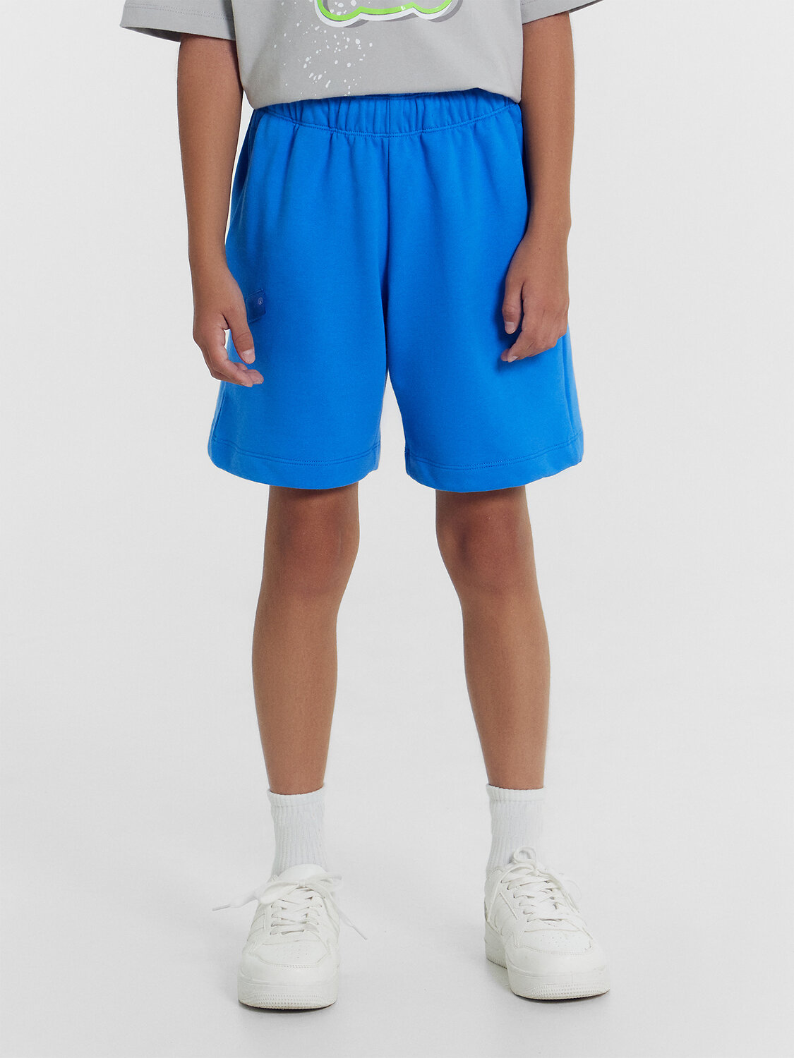 Шорты для мальчиков прямого силуэта из трикотажного полотна футер 3-х нитка без подчеса, 100% хлопок, 350гр. 195см. F3-14, F3-001.01.350. и кулирки 100%хлопок, 160гр., 180см., SJ-2, SJ-001.01.160. Пояс цельнокроенный с эластичной тесьмой внутри, по поясу проложены отделочные строчки. На поясе пробиты петли и вставлен шнур круглый двойной 8мм. 8КXWС-1 с термоусаживаемой трубкой на конце. Карманы в боковых швах, с покдладкой из кулирки. Длина шорт выше колена."