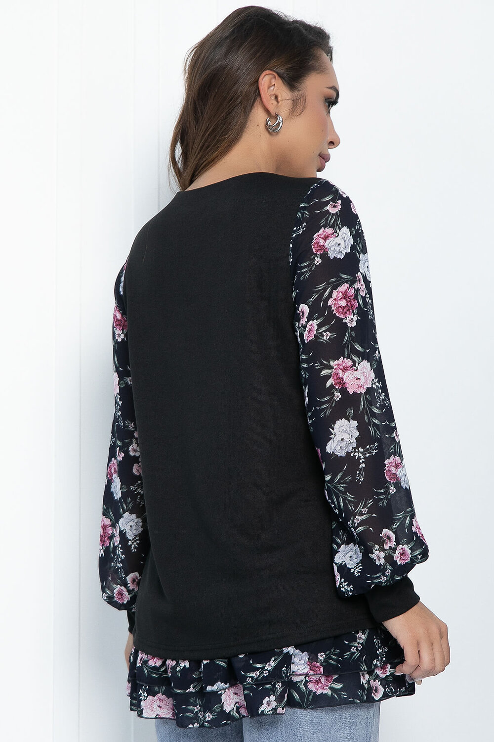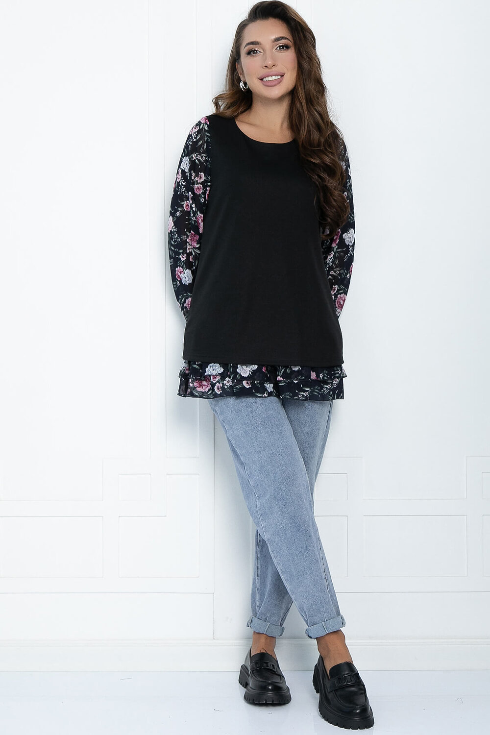 Материал: трикотажное полотно (перед и спинка), шифон (рукава и воланы).