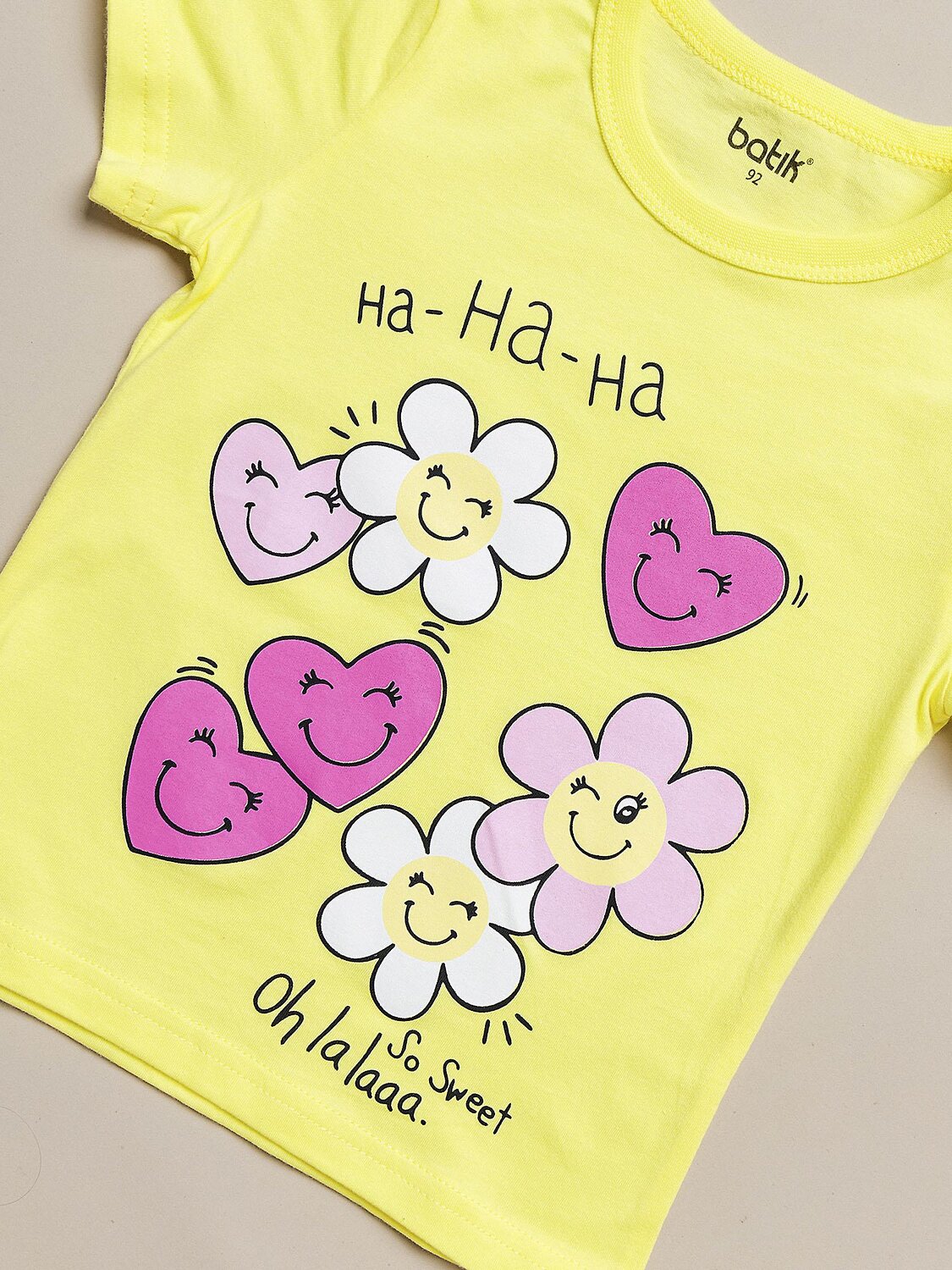 Футболка с коротким рукавом для девочки желтая из натурального хлопка. Детская футболка с милым цветочным принтом выполнена из мягкого трикотажа. Лёгкая ткань со 100% хлопковым составом хорошо пропускает воздух и позволяет телу дышать.