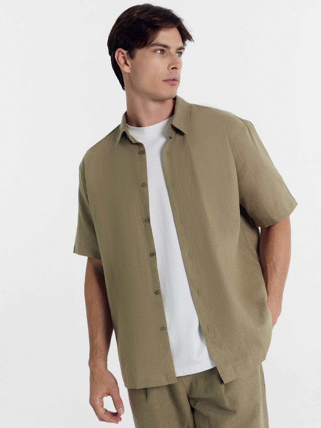 Сорочка верхняя мужская прямого силуэта из ткани, длиной до середины бедер. Рукава короткие втачные. По переду обработана застежка на петли и пуговицы. 7 рубашечных пуговиц. Воротник стояче-отложной с отрезной стойкой. Спинка с отрезной горизонтальной двойной кокеткой. По отлету воротника, по плечевому шву, по пройме и кокетке проложена отделочная строчка. Низ изделия и рукавов обработан швом вподгибку с закрытым срезом.