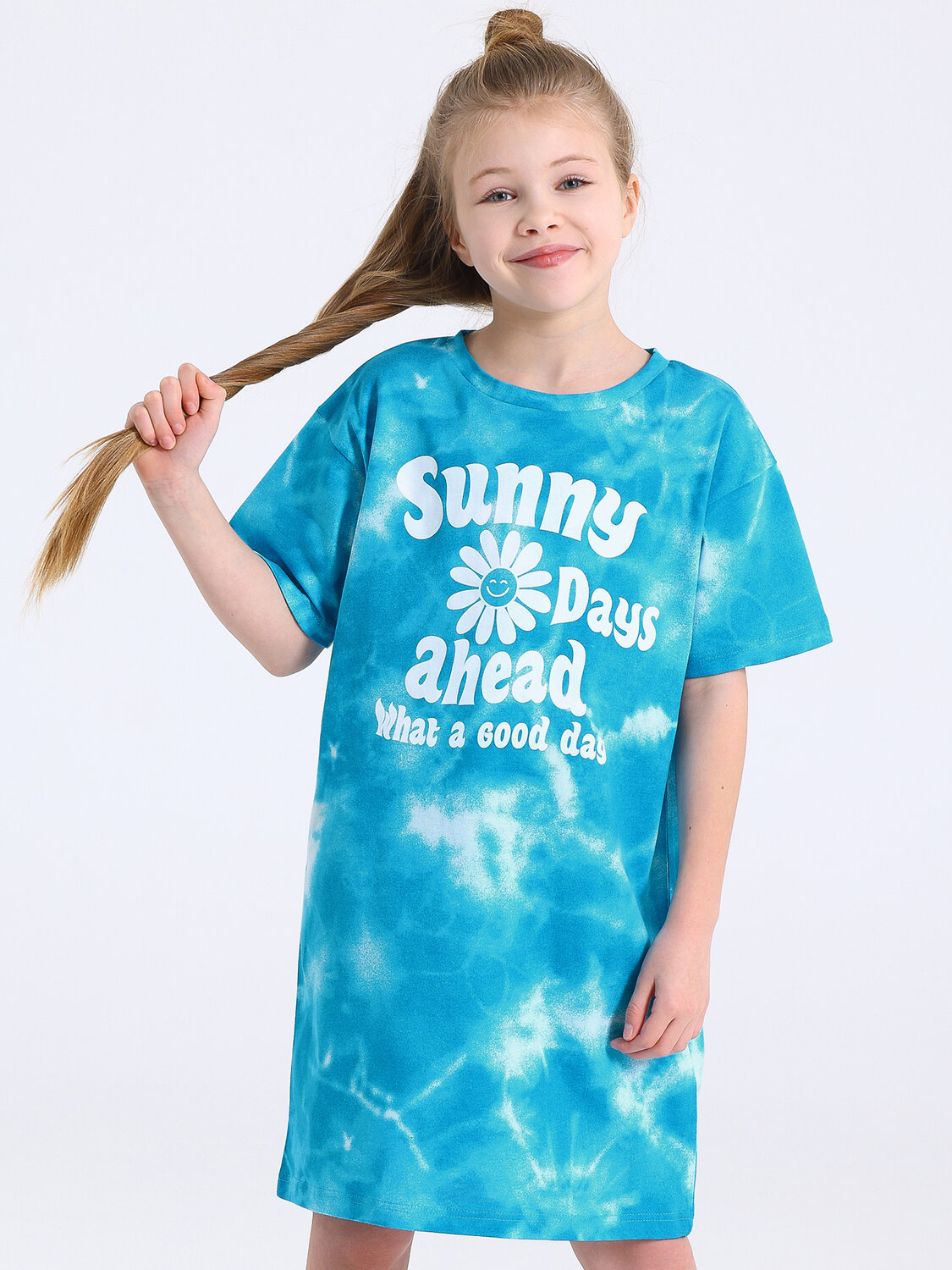 Платье Oversize из кулира - легкого хлопкового полотна. Изделие с короткими рукавами со спущенным плечом, украшено стильным принтом. Отличный выбор для летнего жаркого дня! Уход: только машинная стирка (руками не стирать!) при температуре 40 градусов, без предварительного замачивания. Изделия с печатью и декором перед стиркой необходимо вывернуть на изнаночную сторону.