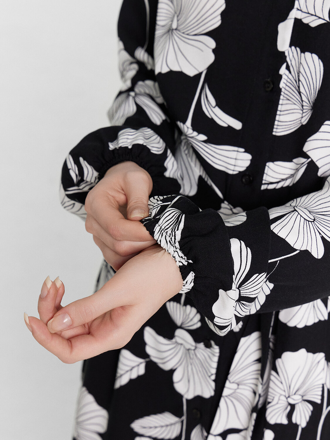 Платье с широким поясом прямого силуэта из ткани. Горловина кргулой формы с втачаным воротником. По переду центральная застежка на пуговицы. На деталях переда и спинки вытачка заложена в одностороннюю складку. Рукав втачной, длинный, по низу подгибка с эластичной тесьмой внутри, образует сборку. В боковых швах обработаны разрезы. Платье длиной ниже колена.