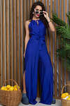 Очаровательный летний комбинезон прямого силуэта с открытыми плечами. Горловина овальной формы с разрезом по среднему шву задней и передней половинок на кулисе, регулирующуюся по длине шнуром. В нижних боковых частях по швам комбинезона высокие разрезы, что придает элегантности и открытия ножек. Объём по линии талии регулируется поясом в шлевках передних и задних половинок.