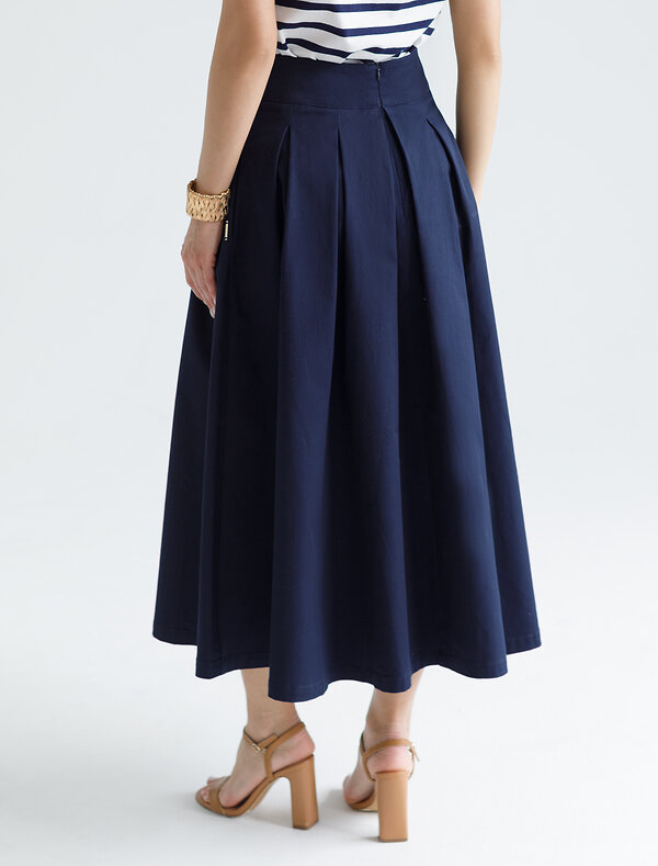 Женская юбка длины миди в складку расклешенного силуэта из хлопкового твила. Модель имеет застёжку на молнию. Визуально подчеркивает талию и бедра, подходит как для повседневного гардероба, так и для особого случая. Натуральный материал ткани обеспечивает высокий уровень комфорта, отличную гигроскопичность и воздухопроницаемость. Эластан в составе изделия минимизрует деформацию модели и продлевает срок носки.