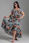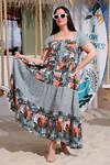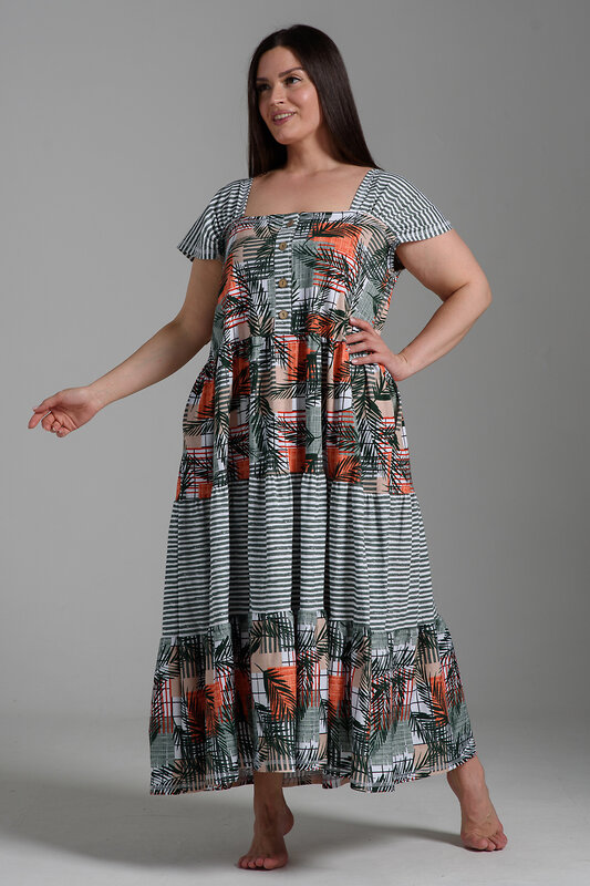 Платье женское расширенное к низу. На полочке планка до линии талии , застежка на четыре петли-пуговицы. Нижняя часть платья состоит из трех ярусов , верхняя часть которых присборена. Бретели расширены, имитируя короткий цельнокроенный рукав.В боковых швах внутренние карманы. Бретели, планка и средний ярус из отделочной ткани в полоску.