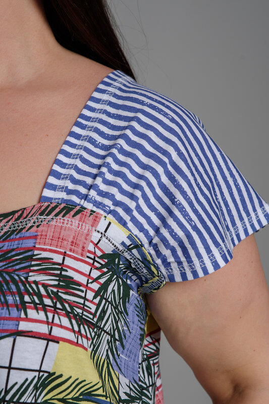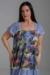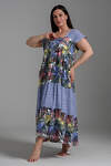Платье женское расширенное к низу. На полочке планка до линии талии , застежка на четыре петли-пуговицы. Нижняя часть платья состоит из трех ярусов , верхняя часть которых присборена. Бретели расширены, имитируя короткий цельнокроенный рукав.В боковых швах внутренние карманы. Бретели, планка и средний ярус из отделочной ткани в полоску.