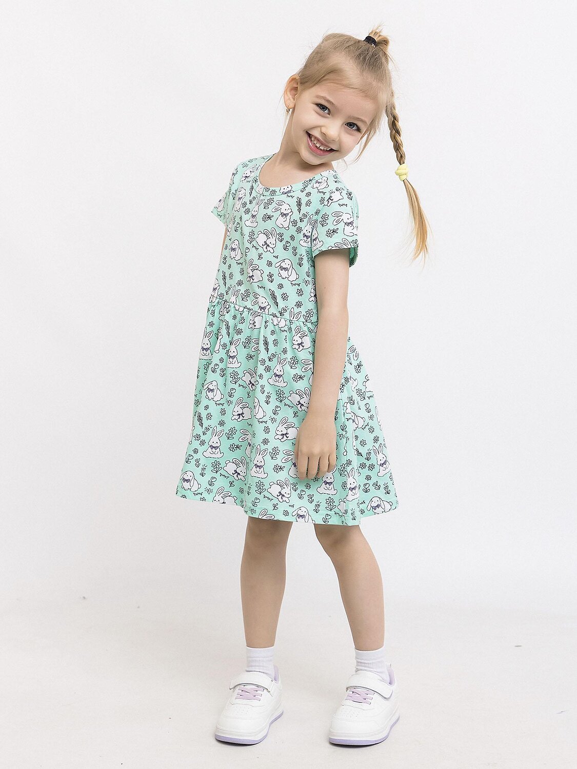 Платье с коротким рукавом в мятном оттенке для девочки из натурального хлопка. Мягкая, дышащая ткань, нежная к детской коже. Милый принт в виде зайчиков. Удобная горловина - широкая округлая форма не натирает шею. Нежный цвет - идеальный оттенок для маленьких модниц. Свободный крой для комфорта в течение всего дня. Короткие рукава - идеально для теплой погоды.