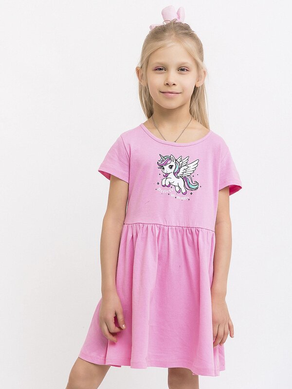 Платье с коротким рукавом розовое для девочки из натурального хлопка. Мягкая, дышащая ткань, нежная к детской коже. Милый принт в виде единорога. Удобная горловина - широкая округлая форма не натирает шею. Нежный розовый цвет - идеальный оттенок для маленьких модниц. Свободный крой для комфорта в течение всего дня. Короткие рукава - идеально для теплой погоды.