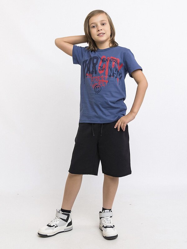 Футболка с коротким рукавом для детей и подростков из натурального хлопка. Расцветка синяя, принт с надписью спереди. Классический круглый вырез – удобная посадка, не натирает шею. Футболка идеальна для прогулок и активных игр. Легко комбинируется с любой детской одеждой: брюками, шортами, джинсами.