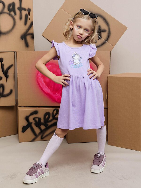 Платье для девочки с коротким рукавом фиолетовое из натурального хлопка. На груди принт в виде котика, круглая горловина. Рукава-крылышки с оборками. Отличный выбор для комфортной повседневной носки летом на прогулку и в любое другое время года в помещении: дома, в садике, в гостях.