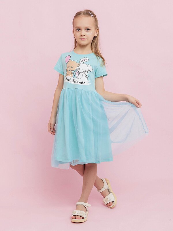 Платье для девочки бирюзовое трикотажное из супрема пенье. Платье летнее с коротким рукавом из мягкой натуральной ткани. На груди симпатичный рисунок в виде милых зверят. Юбка длинная двухслойная с верхним слоем из сетчатой ткани.