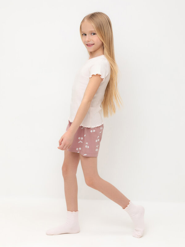 Трикотажная пижама из натурального хлопка. Футболка с короткими втачными рукавами изготовлена из эластичного трикотажа в рубчик. Шорты с эластичной резинкой в поясе выполнены из гладкого трикотажа супрем. Оригинальная набивка выполнена из стойких текстильных гипоаллергенных красителей. Изделие сохраняет цвет и форму после многократных стирок. Все трикотажные полотна производятся в соответсвии с нормами швейцарского сертификата ЭкоТекс.