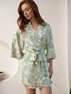 Халат женский изготовлен из вискозы и выполнен в белом цвете. Выполнен в свободном крое, с длинными рукавами и с дизайном под запах. Регулирующий пояс помогает подогнать халат по фигуре, создавая комфортную посадку. Внутри есть тонкие веревочки, вшитые в боковые швы и не позволяющие халату расходиться.