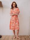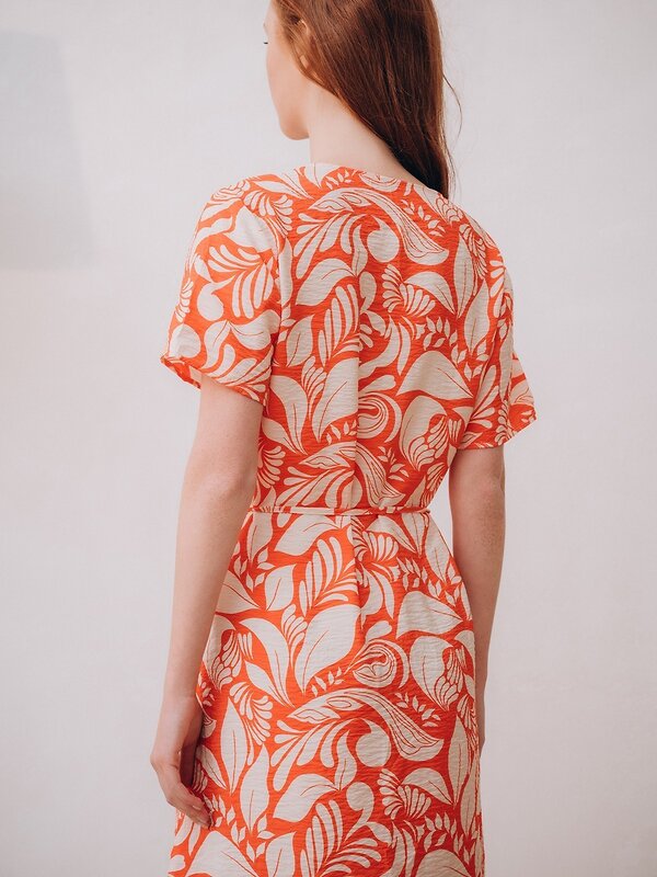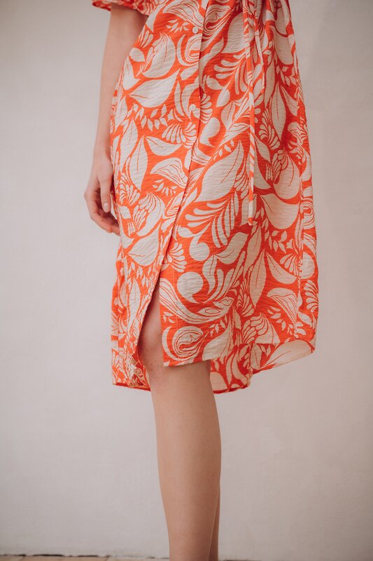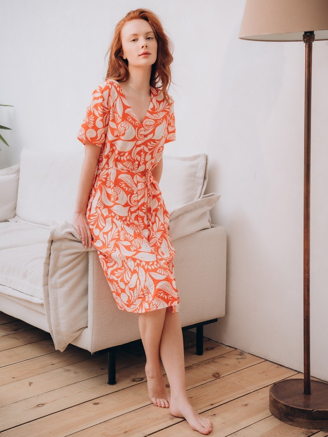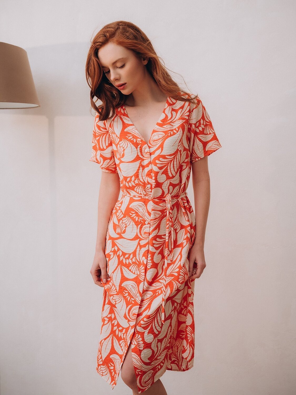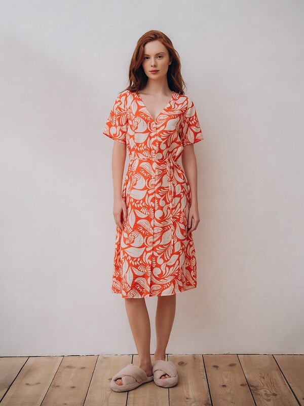 Пляжная туника изготовлена из смесовой ткани и выполнена в оранжевом цвете. Туника на пуговицах имеет короткие рукава и прямой свободный крой. В комплекте идёт тонкий пояс, завязывающийся на талии. На тунику нанесён принт с изображением листьев.