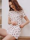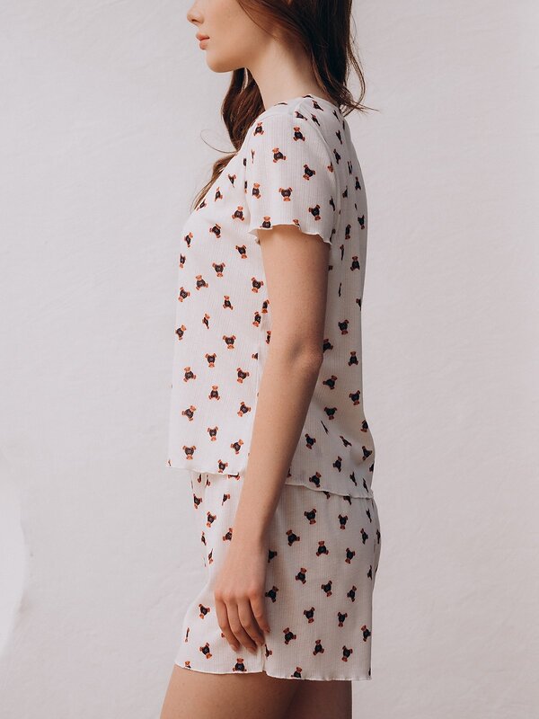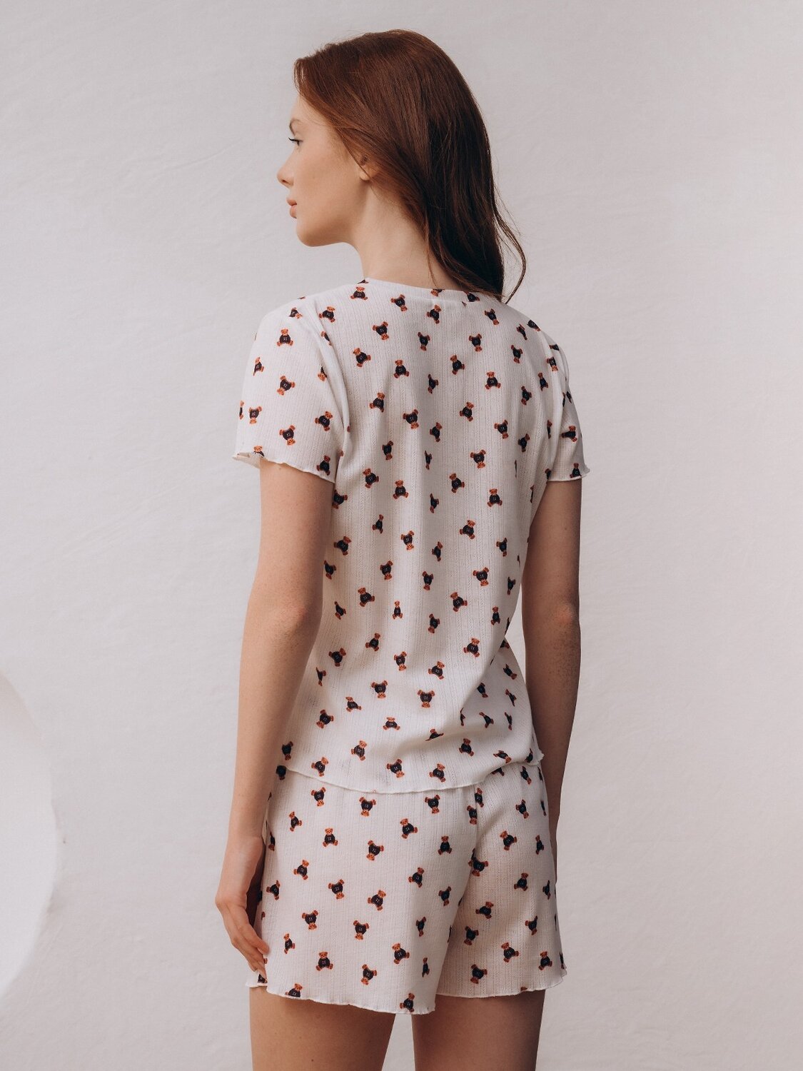 Пижама женская, изготовленная из трикотажного полиэстера, выполнена в белом цвете. Она состоит из футболки и шорт. Футболка прямого кроя имеет длинные рукава и округлый вырез. Верхняя часть застёгивается на две пуговицы. Шорты держатся на талии мягкой эластичной резинкой. На пижаму нанесён принт с изображением плюшевых мишек.