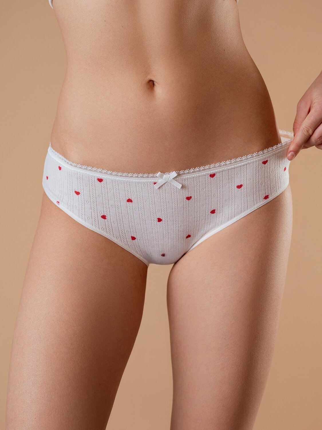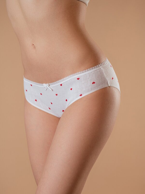 Трусы слипы женские изготовлены из полиэстера с мелкой перфорацией. Имеют среднюю посадку, держатся во время носки тонкой резинкой на талии. На внутренней стороне трусов имеется хлопковая ластовица. На трусы слипы нанесён принт с изображением сердечек.