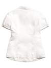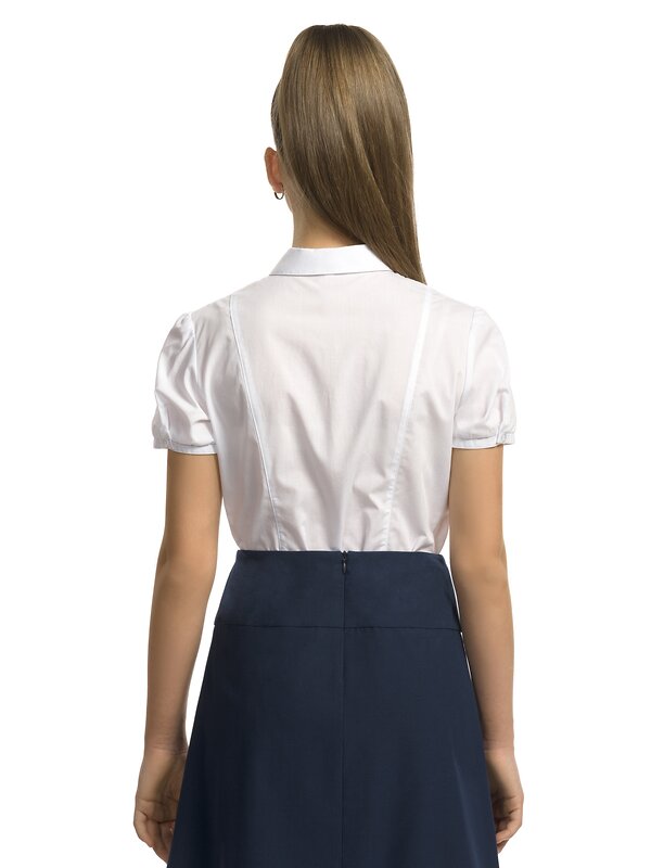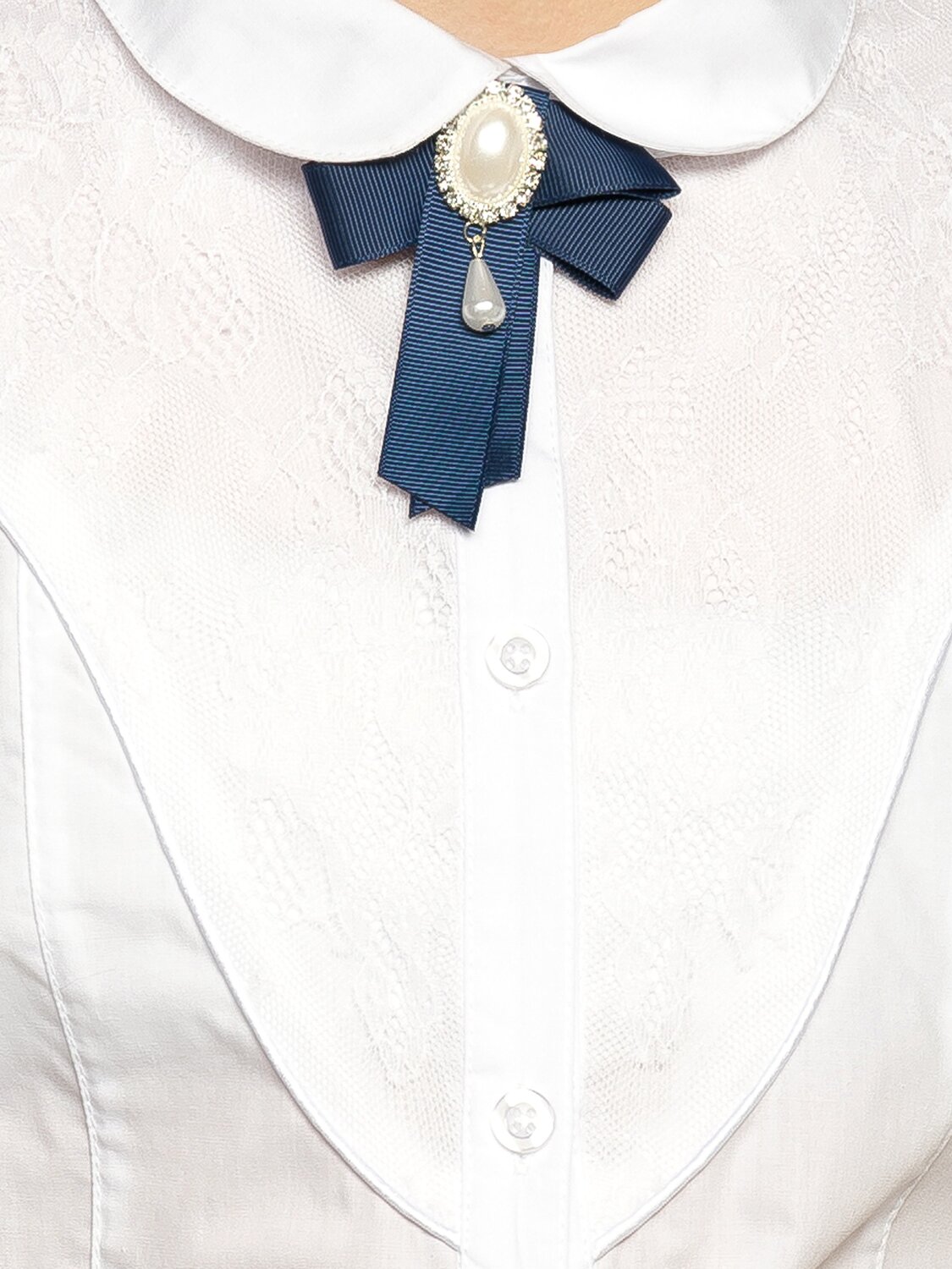 Блузка для девочек полуприлегающего силуэта с рельефами по переду и спинке. По переду нашит фигурный кружевной декор с атласной окантовкой. Рукав фонарик с небольшой сборкой по низу и узкой манжетой. Съемный бант из репсовой тесьмы с жемчужиной и стразами.