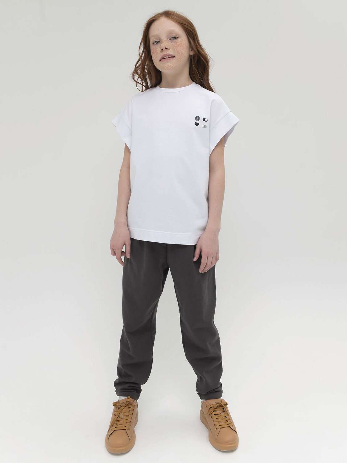 Футболка оверсайз из плотного пластичного трикотажа. Футболка очень комфортная и приятная к телу, держит форму, не мнется. На рукавах акцентная деталь небольшие крылышки. Прямой силуэт подарит свободу и не будет стеснять движений. По переду трендовая минималистичная мобильная инфографика: включи мозг, выключи чувства. Лаконичный дизайн прекрасно сочетается как со школьной формой, так и с одеждой для повседневной носки, и станет основой для разнообразных стильных образов.