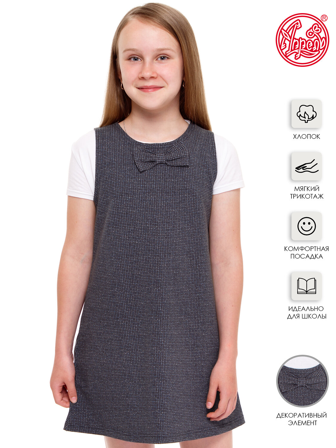 Сарафан для девочки выполнен из футера - плотного хлопкового полотна с лайкрой. Изделие без рукавов, украшено аккуратным бантиком. Отличный вариант для школьницы на каждый день! Уход: только машинная стирка (руками не стирать!) при температуре 40 градусов, без предварительного замачивания.