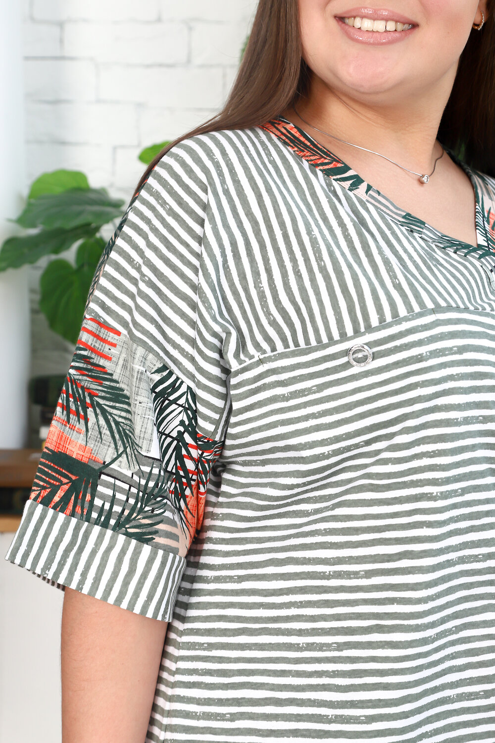Костюм женский: туника и шорты. Туника полуприлегающего силуэта, шорты прямые. Застежка на петли-пуговицы. На полочке и спинке кокетки. По линии притачивания кокетки полочки внутренние горизонтальные карманы с пуговицами. Борт туники окантован широкой косой бейкой, на спинке складка. На передней части шорт внутренние карманы, низ на манжете, пояс прострочен на многоигольной машине. Особую неповторимость костюму придает сочетание двух тканей-компаньонов: полоса и пальмовый принт.