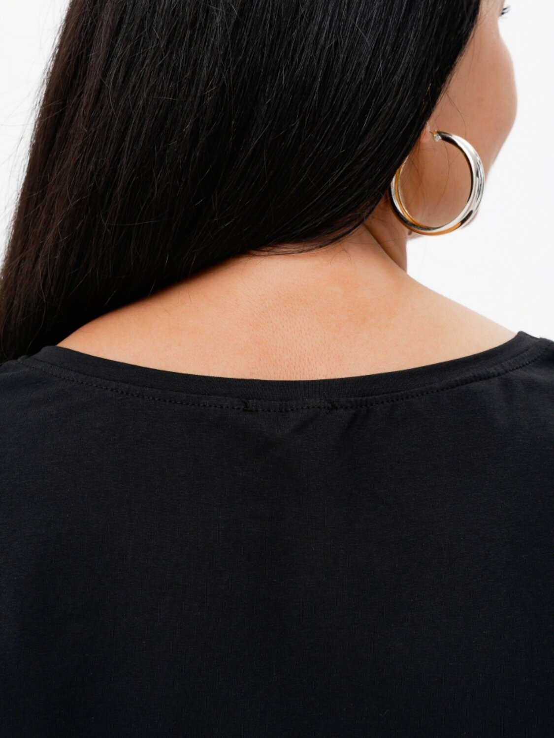 Носить такую футболку могут как леди молодого возраста, так и дамы, перешагнувшие порог 50 лет. Плечевые и грудные вытачки перенесены в соединительные швы кокетки, благодаря чему модель любого размера, начиная с 46 и заканчивая 60-м, идеально «садится» по фигуре.