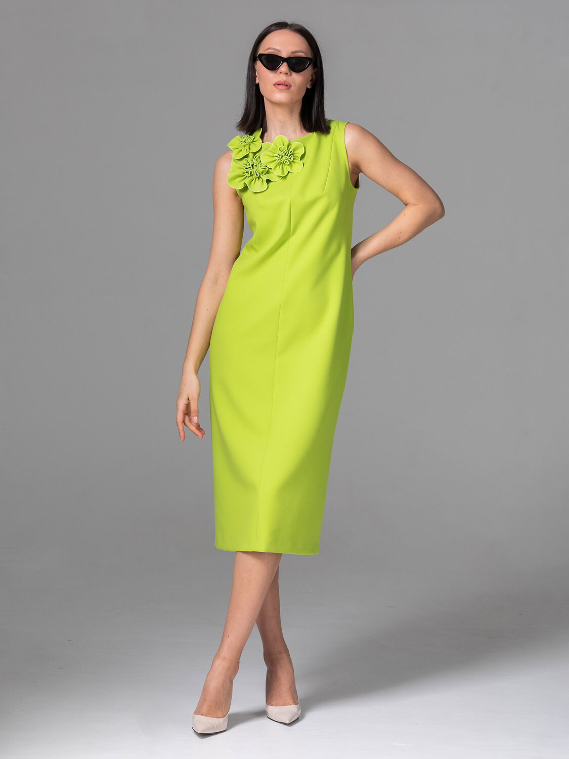 Платье миди. Перед и спинка со средним швом. Сзади потайная застёжка молния и высокий разрез. Цветы в комплект не входят. Ткань из прочных двойных ниток, что способствует долговечности и стойкости к изнашиванию. Технология по производству ткани из ниток ReCycle помогает оберегать и заботиться о природе, бережнее относиться к ресурсам нашей планеты. Благодаря многоэтапной и тщательной переработке, ткань абсолютно экологична и безопасна для носки.