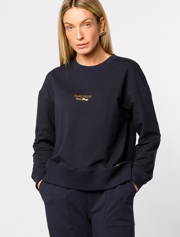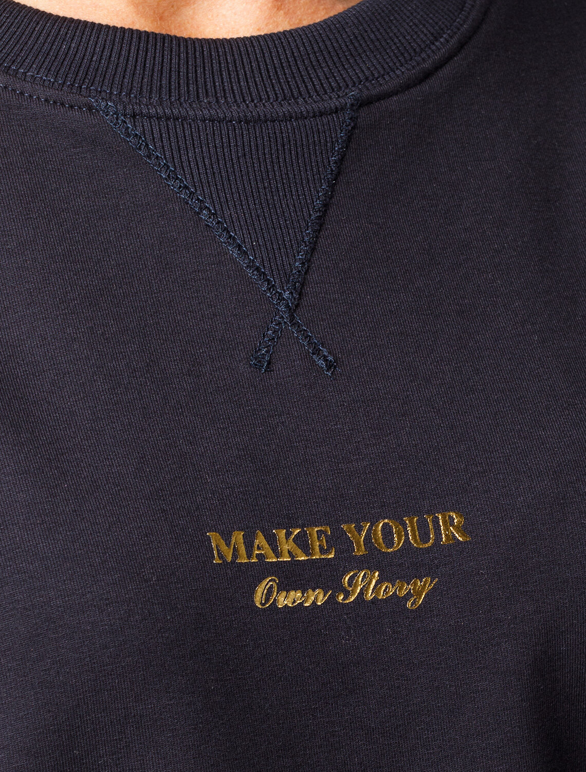 Перевод принта: Make your own story - стань автором своей истории. Джемпер среднего объема со спущенным плечом выполнен из футера двухнитки с эластаном. Принт нанесен фактурной золотой краской. Эластичный материал гарантирует комфорт и формоустойчивость. Сочетается в костюме с брюками D44.138, D44.139 и шортами D48.008. Изделие дополнено металлическим логотипом бренда.