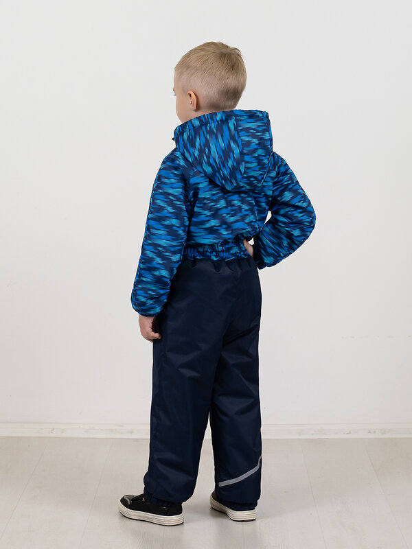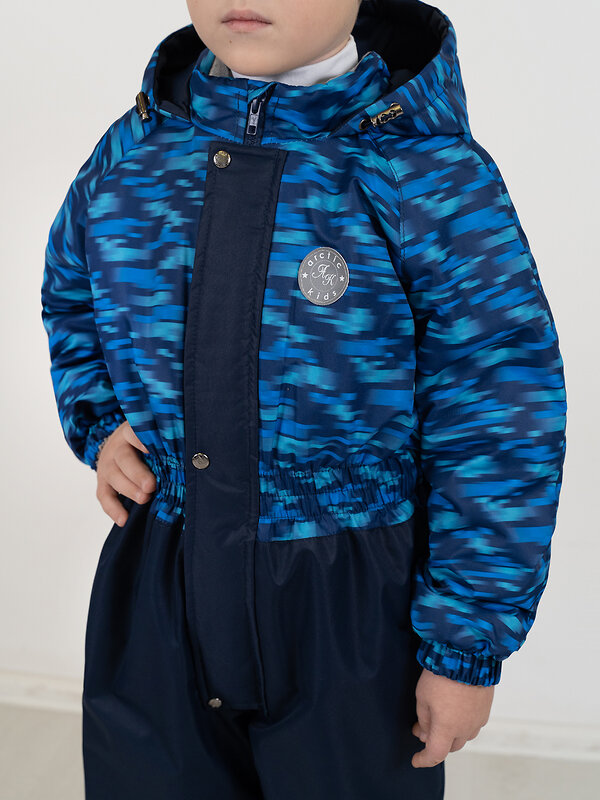Демисезонный детский мембранный комбинезон комбинированный: одноцветный и с рисунком. Утеплитель – тинсулейн 100 гр, подкладка – трикотажная кулирка. Комбинезон свободного силуэта, на талии резинка. Капюшон несъемный. Манжеты на резинке на рукавах и штанинах. Съемные штрипки. Молния прямая, переходящая в небольшой воротничок стойку с клапаном для бегунка. Внутренняя и внешняя ветрозащитная планка на кнопках. Спереди небольшая светоотражающая нашивка. Сзади на одной из штанин светоотражающая полоса.