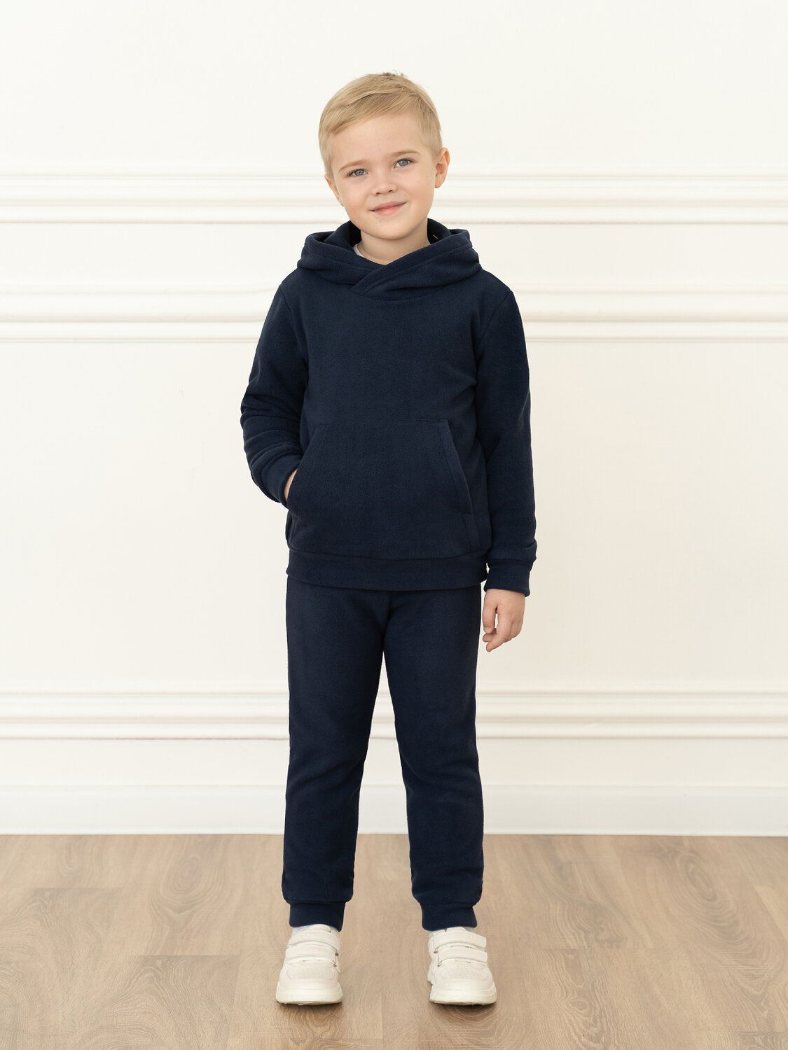 Назначение: детский комплект одежды для занятий спортом, прогулок и дома для мальчиков и девочек. Свойства ткани: прочный, мягкий на ощупь, приятный к телу, тёплый флис. Удерживает тепло и согревает даже во влажном состоянии. Особенности модели: детский флисовый костюм. Брюки на резинке в поясе, манжеты на штанинах. Толстовка с капюшоном и карманом-кенгуру. Низ и рукава на манжете. Костюм сшит в однотонном темно-синем цвете.