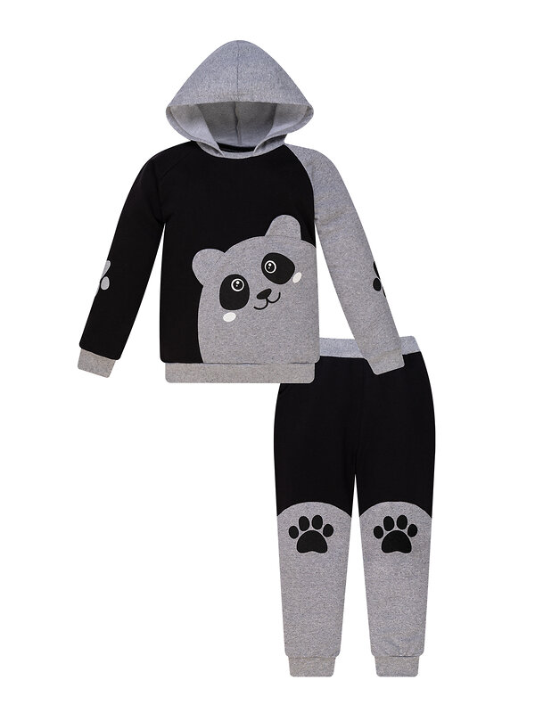 Износостойкий, приятный к телу, плотный трикотаж. Хорошо переносит частые стирки, стойкий к появлению катышков и потёртостей. Спортивный детский костюм основного черного цвета с серыми вставками. Брюки на резинке в поясе, по бокам карманы. Толстовка с капюшоном, рукавами регланами, спереди аппликация панда с пришитыми ушами. Низ толстовки, пояс брюк, манжеты на рукавах и на штанинах из мягкого трикотажа.
