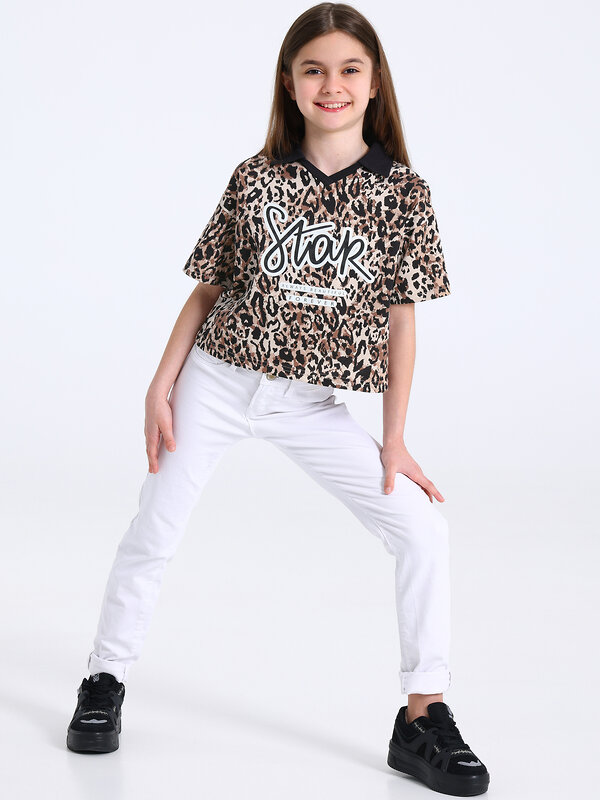 Поло для девочки выполнено из кулира - легкого хлопкового полотна. Изделие свободного кроя, со спущенным плечом, короткими рукавами и V-образным вырезом горловины. Поло дополнено отложным воротником и печатью. Уход: только машинная стирка (руками не стирать!) при температуре 40 градусов, без предварительного замачивания. Изделия с печатью и декором перед стиркой необходимо вывернуть на изнаночную сторону.