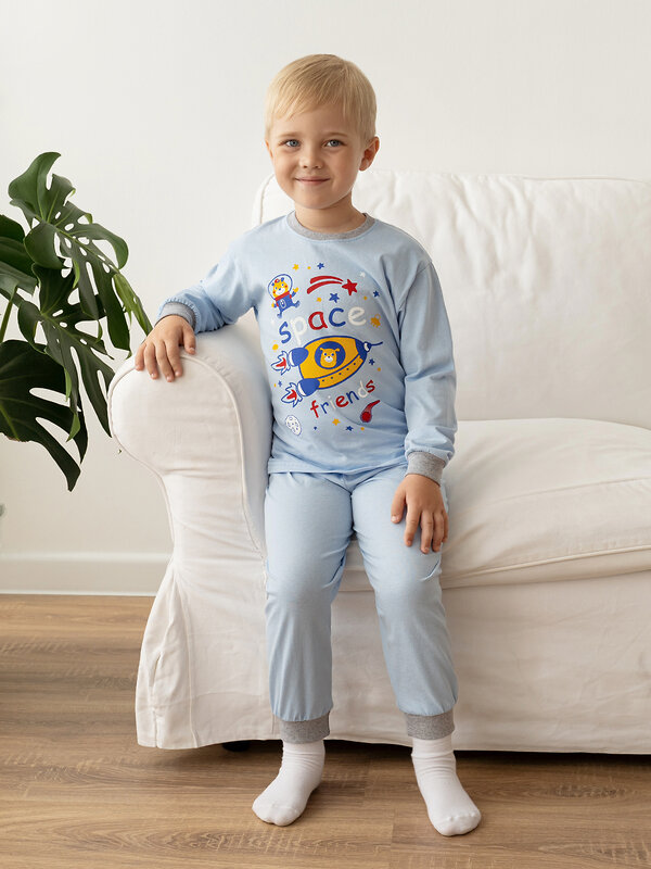 Детская трикотажная пижама однотонная из хлопковой кулирки. Этот комплект свободного кроя из свитшота и брючек на поясе. Манжеты из мягкой эластичной рибаны серого цвета. Горловина эластичная, обработана такой же рибаной. На свитшоте красивый большой принт.