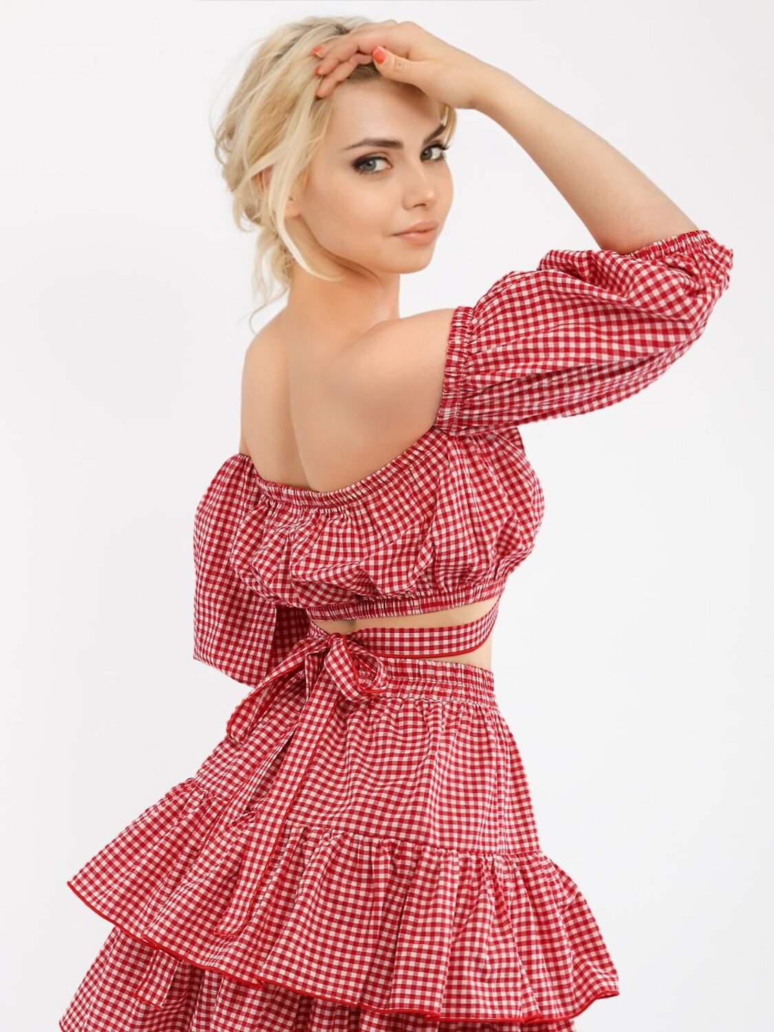 Размер 48 длина топа 18 см, ОГ 80-94 см, длина рукава 30 см, длина завязок 98 см, длина юбки 48 см, ОТ 70-74 см.