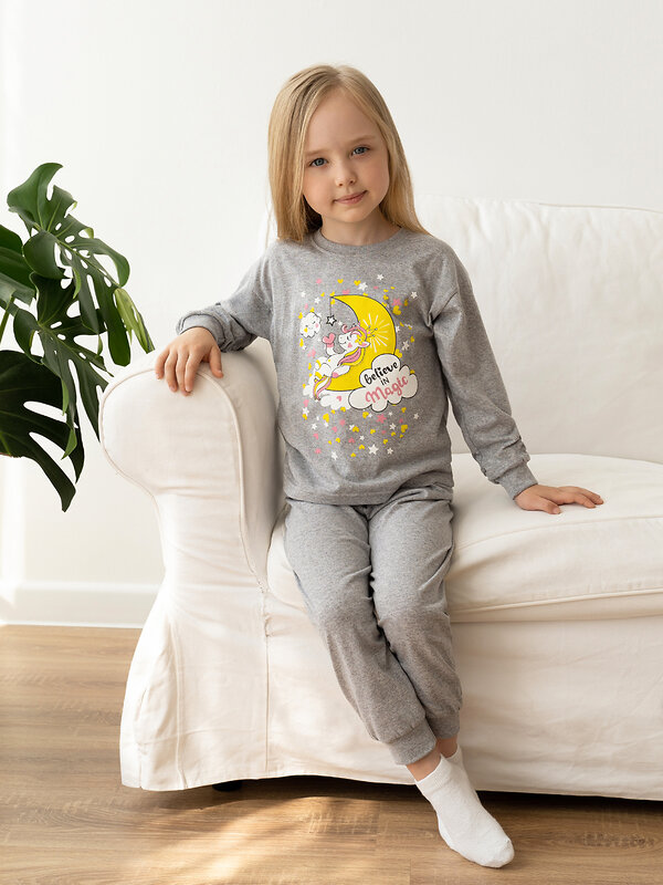 Детская трикотажная пижама однотонная серая из хлопковой кулирки. Этот комплект свободного кроя из свитшота и брючек на поясе. Манжеты из мягкой эластичной рибаны серого цвета. Горловина эластичная, обработана такой же рибаной. На свитшоте красивый большой принт.