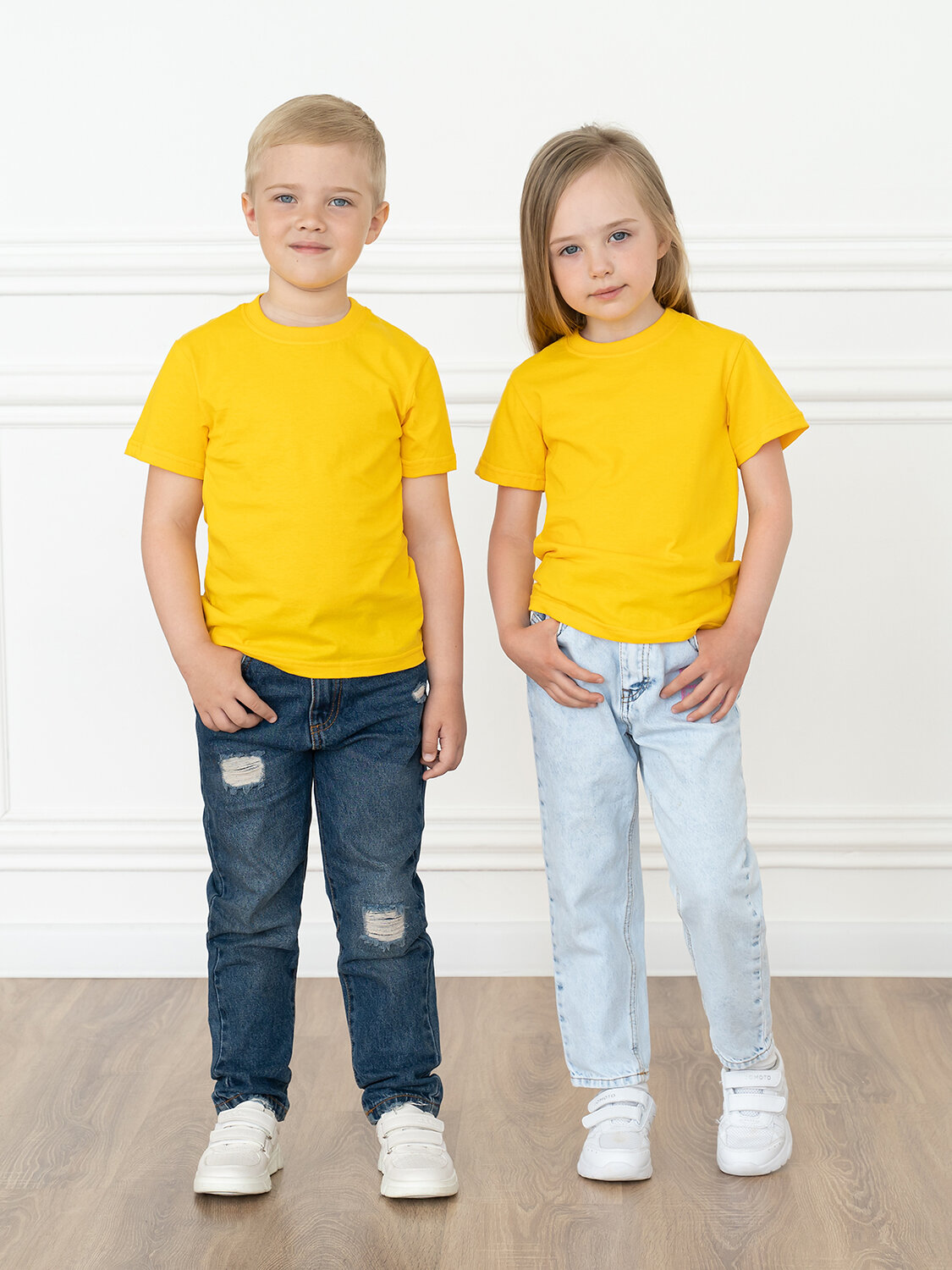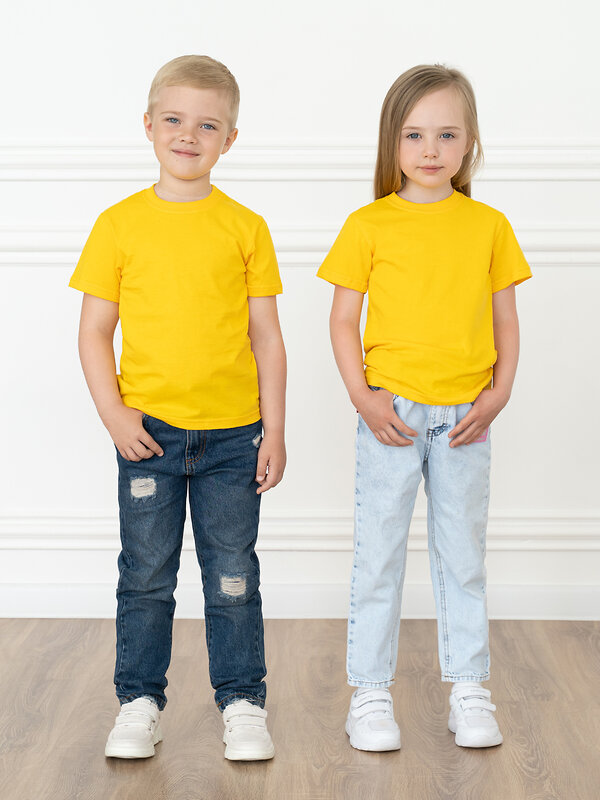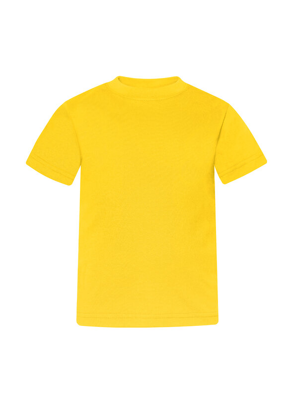 Удобный и универсальный предмет гардероба. Футболка однотонного желтого цвета. Горловина отделана трикотажной бейкой. Край рукавов и низ прошиты швом вподгибку.
