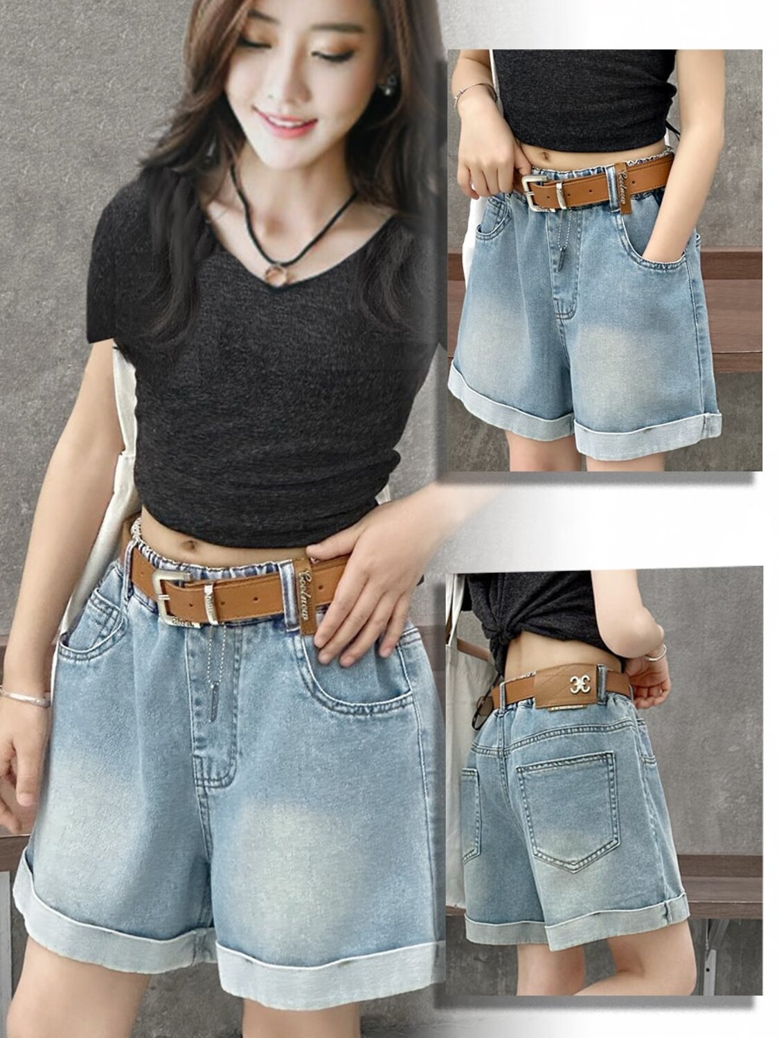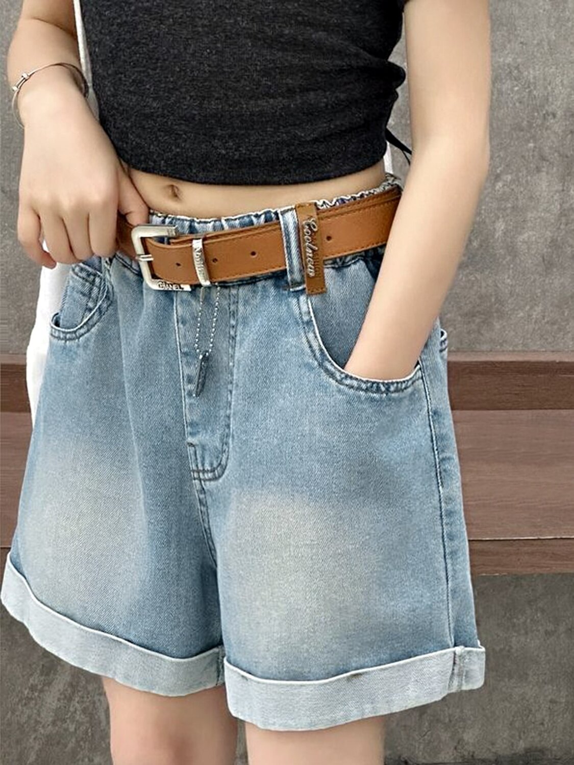 Джинсовые шорты с отворотами незаменимая вещь в гардеробе каждой девочки. Они легко комбинируются с любой майкой или футболкой. Пояс на широкой, эластичной резинке, без молнии и пуговиц. Модель особенно актуальна на прогулке, на пляже, в бассейне или в путешествии. Ремень в комплект не входит.