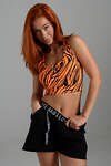 Топ на узких бретелях, с округлой горловиной на полочке и вырезом борцовка сзади. Горловина, проймы и вырез на спинке обработаны бейкой из основного полотна.