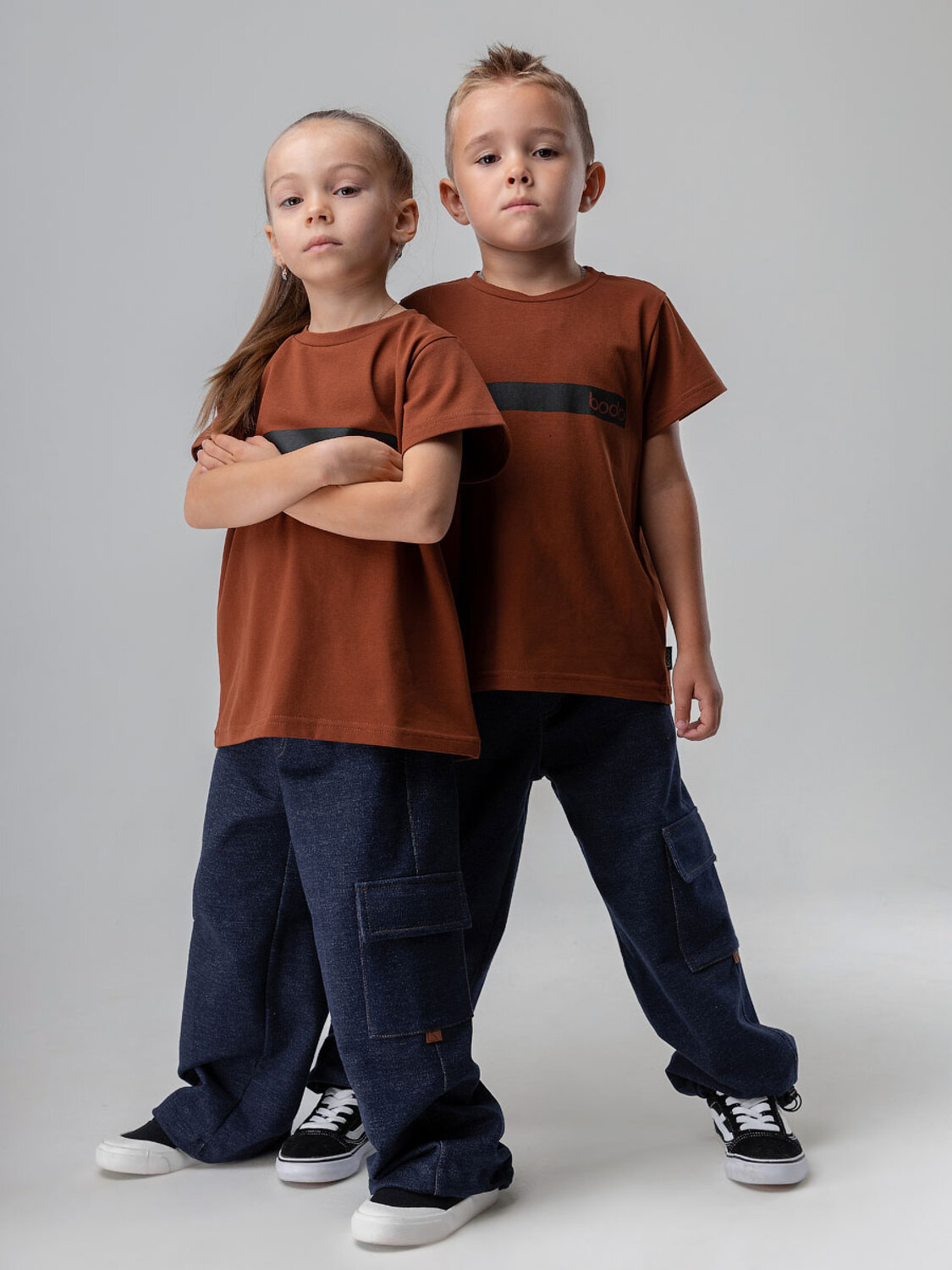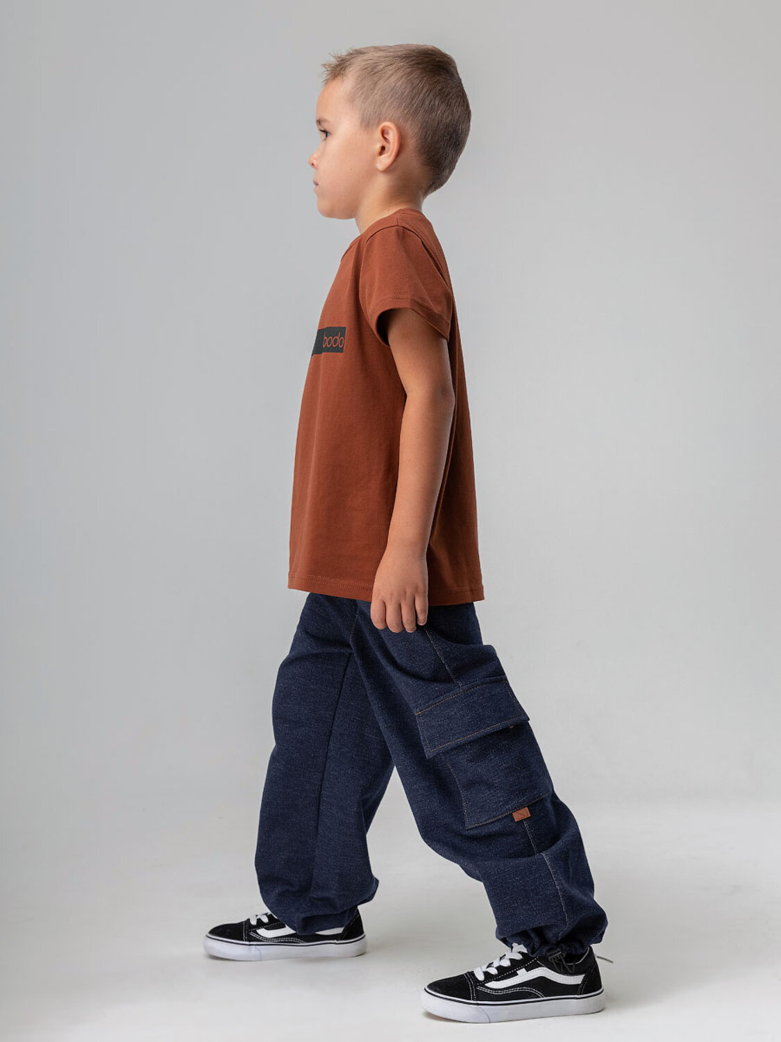 Брюки карго детские. Брюки с накладными карманами на разном уровне, без карманов с отрезным бочком, низ на подрубке с резинкой и стопором. По низу брюк расположена резинка-утяжка, которая позволяет регулировать ширину штанин. Для безопасности петельку из резинки нужно закрепить с помощью кнопки, расположенной с внутренней стороны. Состав: футер двухнитка 100% хлопок
