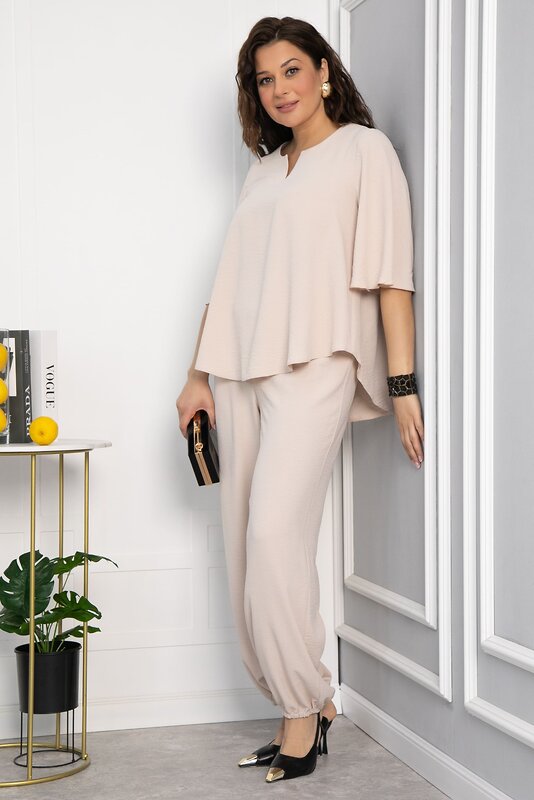 Легкий, приятный к телу брючный костюм, преимущественно из хлопка, покорит вас с первого прикосновения. Блуза свободного кроя с воздушными фалдами имеет рукав средней длины и V-образный вырез. Свободные брюки в стиле палаццо придают костюму легкость и особый шик. Брюки имеют пояс на комфортной резинке, что позволяет чувствовать себя свободно и не сомневаться при выборе размера. Низ брюк деликатно собран резинкой, которую по желанию можно растянуть/стянуть по размеру своей ножки или вовсе убрать, и тогда у вас получатся прямые к низу брюки. Свободный силуэт костюма подходит абсолютно для любой фигуры. Костюм актуален для любого мероприятия, романтических встреч и летних прогулок.